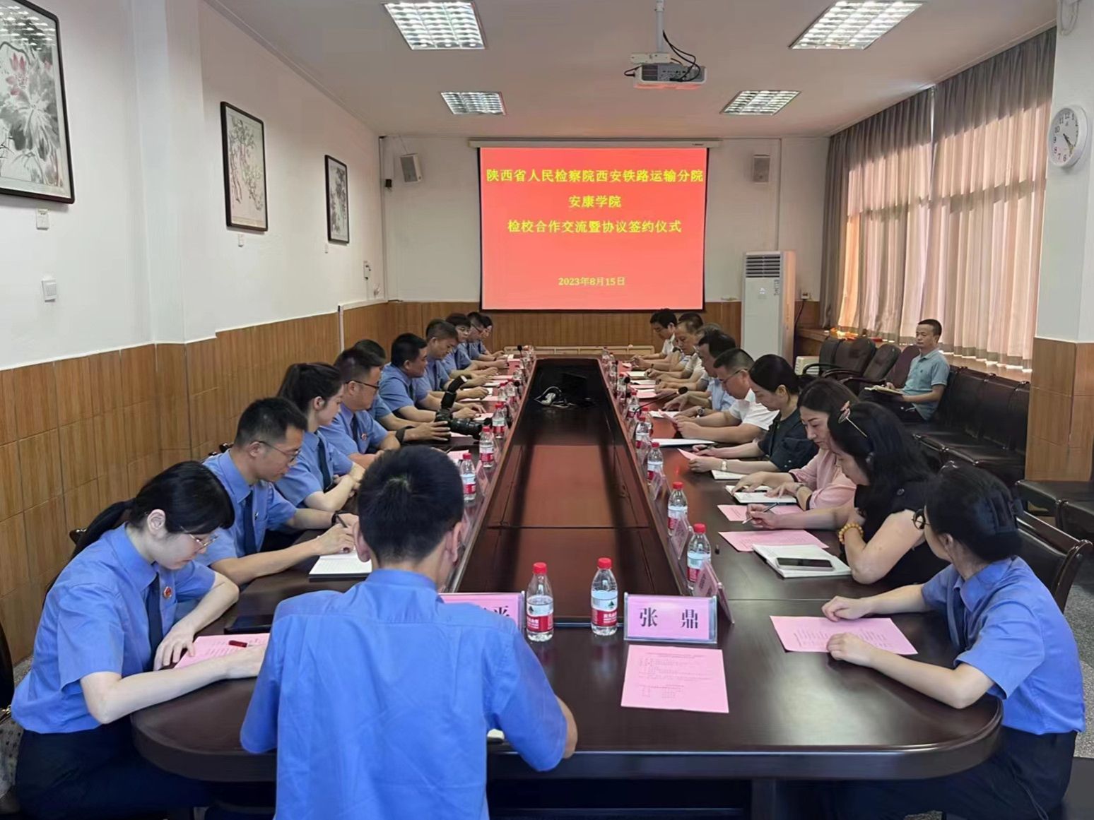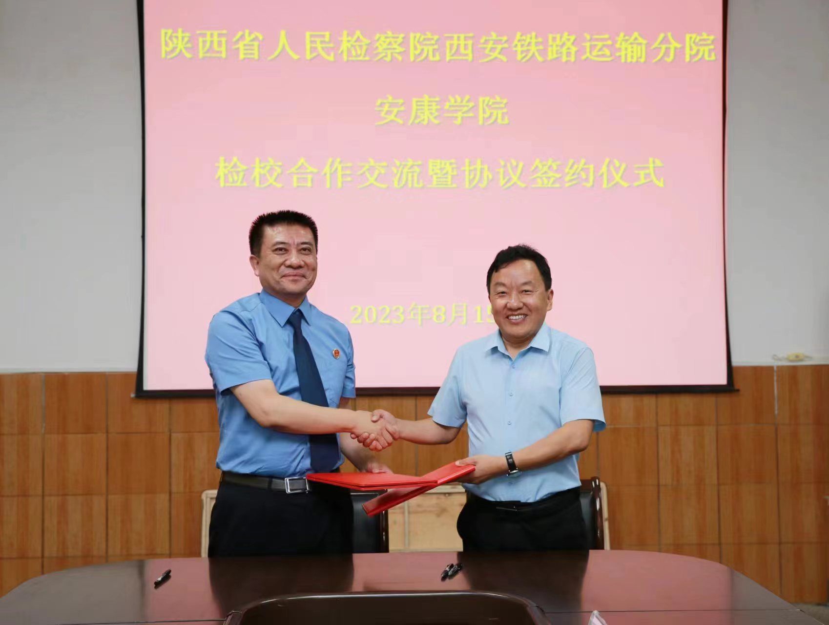 8月15日,陕西省人民检察院西安铁路运输分院党组书记、检察长王勇一行莅临开元官网调研座谈并签订合作协议。校长钟生海出席座谈会,副校长余谦陪同调研并主持会议。