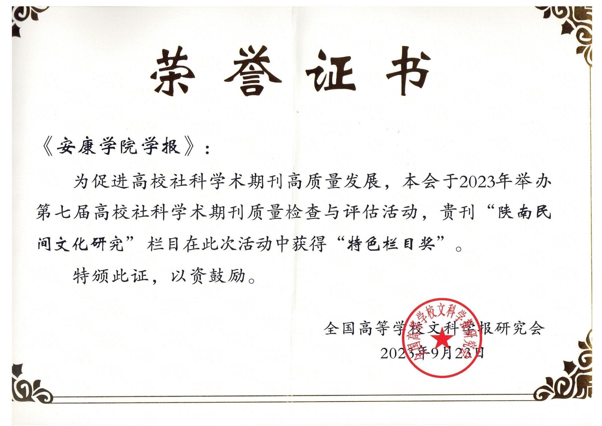 9月22日至24日,全国高等学校文科学报研究会成立35周年庆祝大会暨九届三次理事会会议在湖北宜昌举行。会议公布了第七届高校社科学术期刊质量检查与评估结果。《KY开元集团官网学报》“陕南民间文化研究”栏目获“特色栏目奖”。