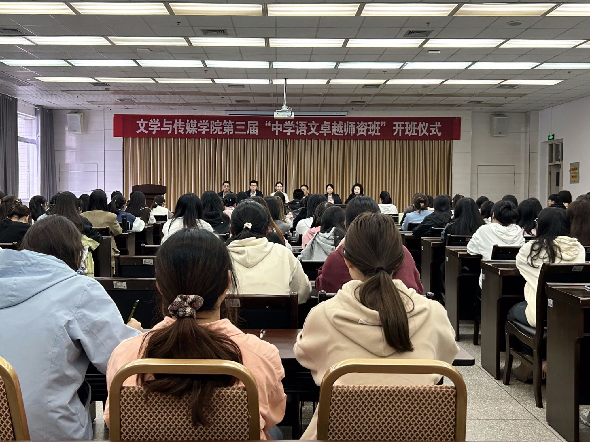 10月11日,开元官网文传学院第三届“中学语文卓越师资班”在江南校区图书馆六楼报告厅顺利开班。陕西省教学名师、基础教育领军人才邱俊,文传学院领导班子全体成员,第三届“中学语文卓越师资班”班主任和全体学生参加了开班仪式。