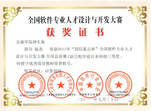由教育部高等学校计算机科学与技术教学指导委员会、工业和信息化部人才交流中心主办,中国软件行业协会、教育部高等学校高职高专计算机类专业教学指导委员会协办的第二届全国软件专业人才设计与开发大赛全国总决赛于7月14日在北京大学计算中心举行。来自北京航空航天大学、浙江大学、华中科技大学等352所院校的900余名各省选拔赛一等奖获得者参加了总决赛。我院电信系计算机科学与技术专业09级学生陈勇继获得陕西赛区本科组一等奖后,最终获得全国三等奖。