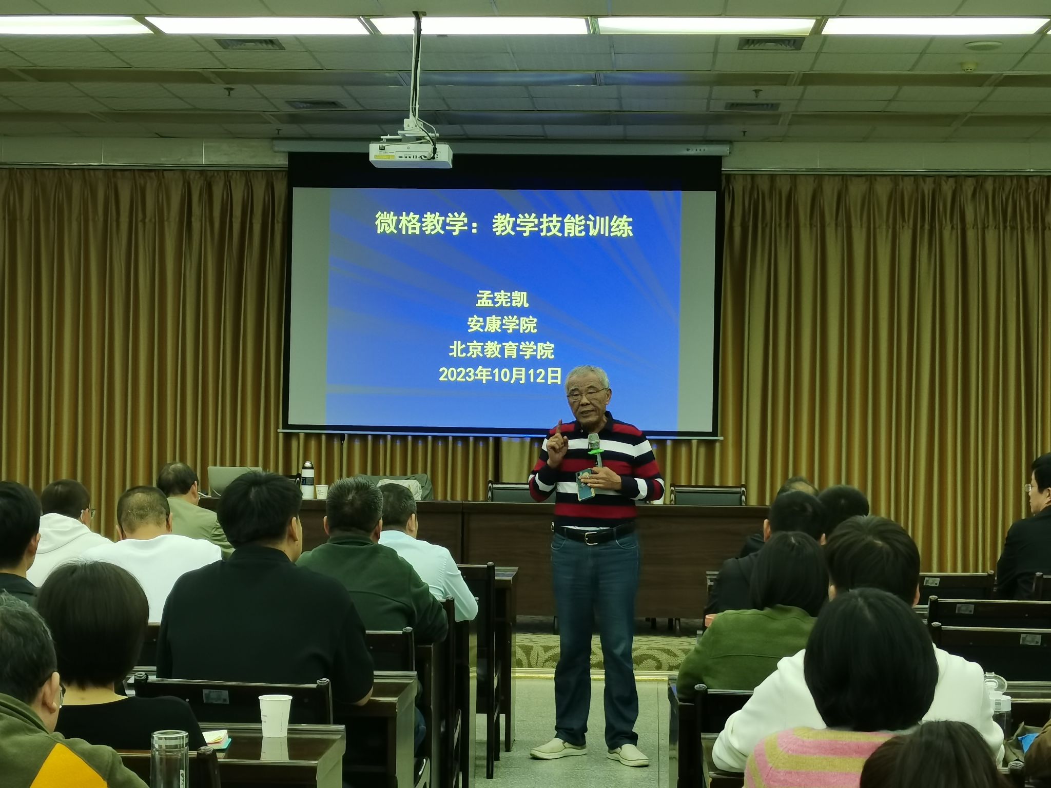 近日,学校在江南校区图书馆六楼报告厅组织开展了本学年第四期(总第二十四期)教师课堂教学能力提升系列培训。本次培训特邀中国教育技术协会微格教学专业委员会会长孟宪凯教授作《微格教学:教学技能训练》专题报告。师范专业教学副院长、系主任、专业负责人、专任教师以及部分师范专业学生共200余人参加了培训。培训由教务处处长汪义瑞主持。