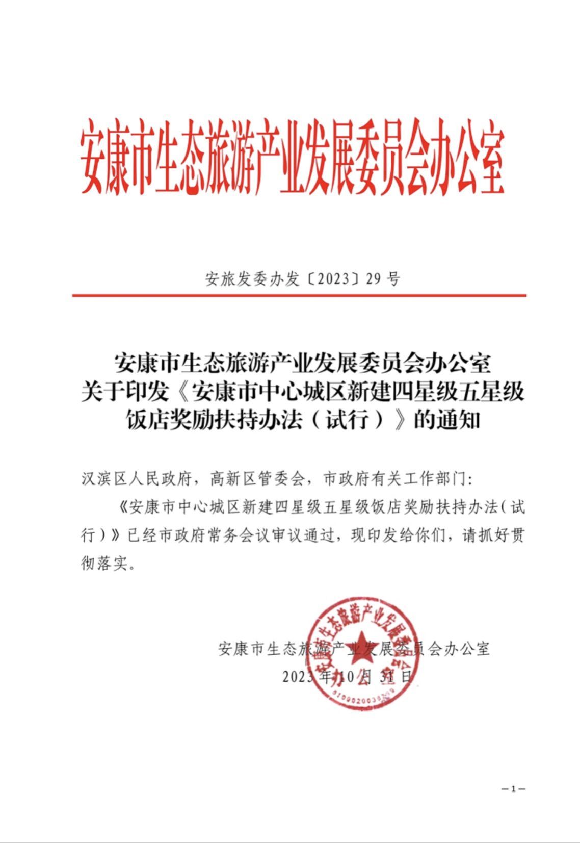 近日,由开元官网负责起草的《安康市中心城区新建四星级五星级饭店奖励扶持办法(试行)》(安旅发委办发〔2023〕29 号),经安康市人民政府2023年第14次常务会议审议通过,2023年10月31日正式印发并实施。