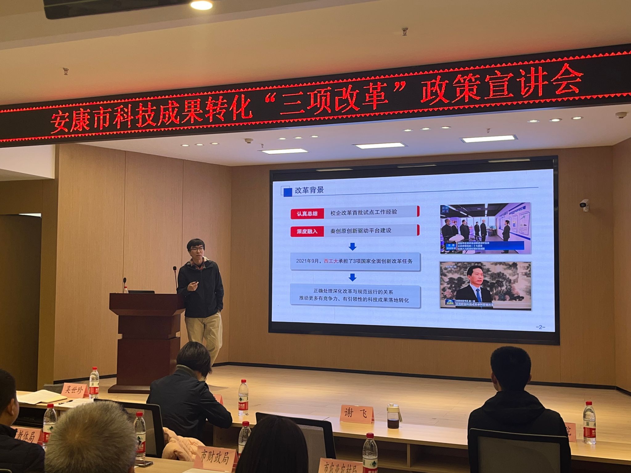 会议邀请了省“三项改革”政策宣讲团成员、省委党校翟晓舟教授和省科技资源统筹中心创新创业与科技金融部副部长谢飞进行政策宣讲。翟晓舟解读了推广科技成果转化“三项改革”试点经验实施方案、陕西省深化科技成果转化“三项改革”十条措施、科技成果转化“三项改革”线上路演平台实施方案、陕西省高校院所“三项改革”科技成果转化“以演代评”实施方案等政策文件;谢飞从西北工业大学“三项改革”试点案例切入,详细介绍了“三项改革”科技成果转化路演相关政策,与参会人员就科技成果转化过程中的工作流程、创办企业时的资金支持、线上路演等相关问题展开了互动交流。