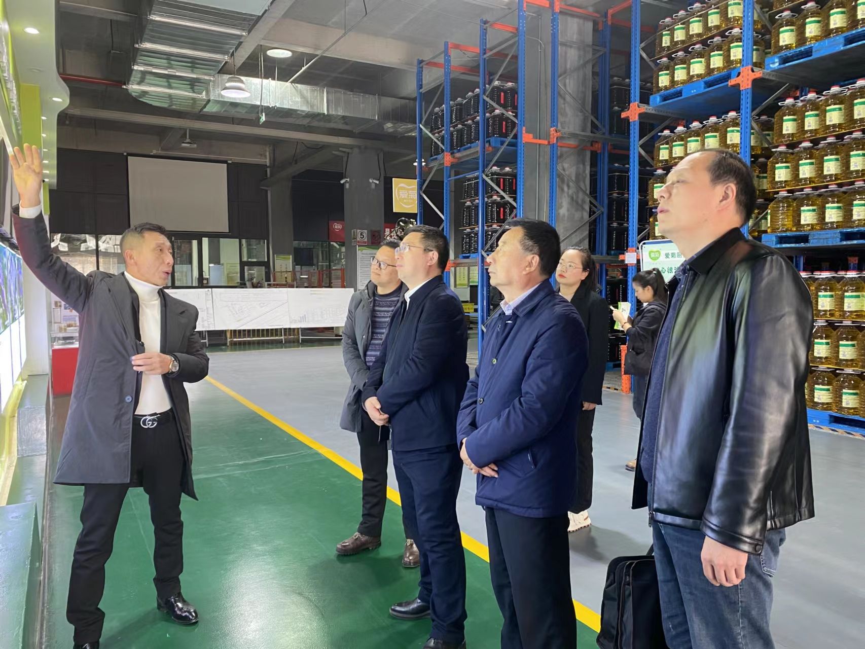 余谦一行实地参观了油脂加工车间、爱粮科普馆、企业发展史馆、产品展示馆和党建中心、研学体验中心,了解爱菊集团发展历程及企业践行“一带一路”倡议与中亚国家合作情况。