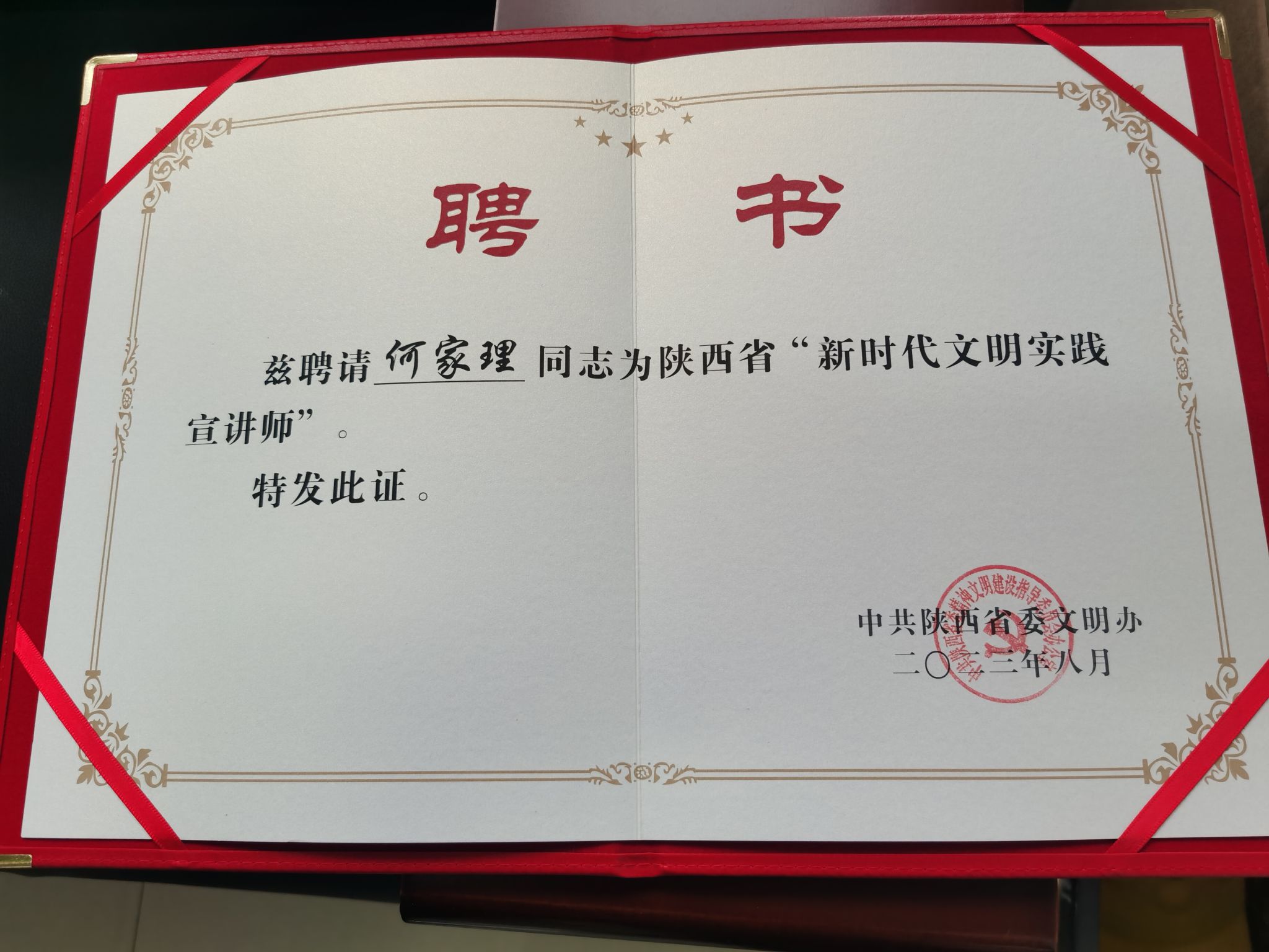 2023年8月,陕西省文明办文件通知,要求各市组织推荐陕西省“新时代文明实践宣讲师”,开元官网党委宣传部积极组织申报,推荐马克思主义学院何家理教授填报申请材料、录制《乡村振兴战略的背景及实施路径探讨》微视频报送安康市文明办联评,后上报省文明办经过联评何家理被聘为陕西省“新时代文明实践宣讲师”。
