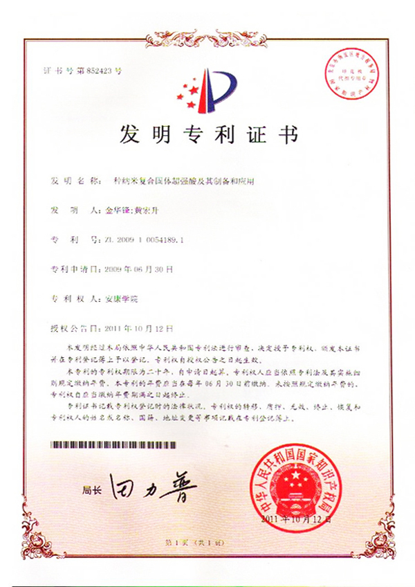 近日,从国家知识产权局获悉,我院教师金华锋、黄宏升申请的专利《一种纳米复合固体超强酸及其制备和应用》于10月12日获得国家知识产权局授权(专利号:ZL 200910054189.1)。这是我院获得的第一项国家发明专利,实现了我院国家发明专利授权“零”的突破。