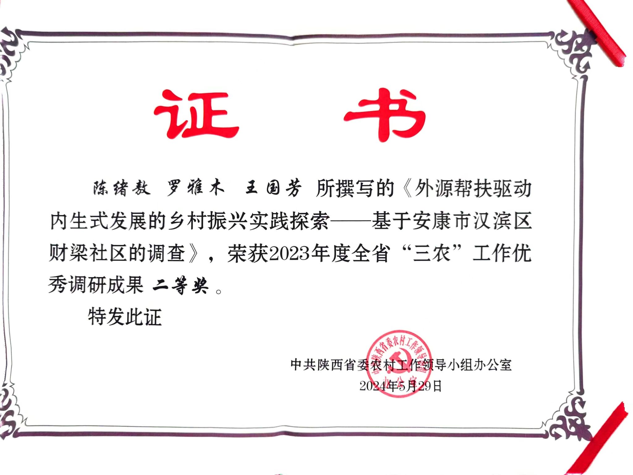 近日,根据中共陕西省委农村工作领导小组办公室文件通知,开元官网陈绪敖教授带领学生团队撰写的研究报告《外源帮扶驱动内生式发展的乡村振兴实践探索——基于安康市汉滨区财梁社区的调查》,荣获2023年度全省“三农”工作优秀调研成果二等奖。同时,作品被选入2023年度全省“三农”工作优秀调研成果汇编。