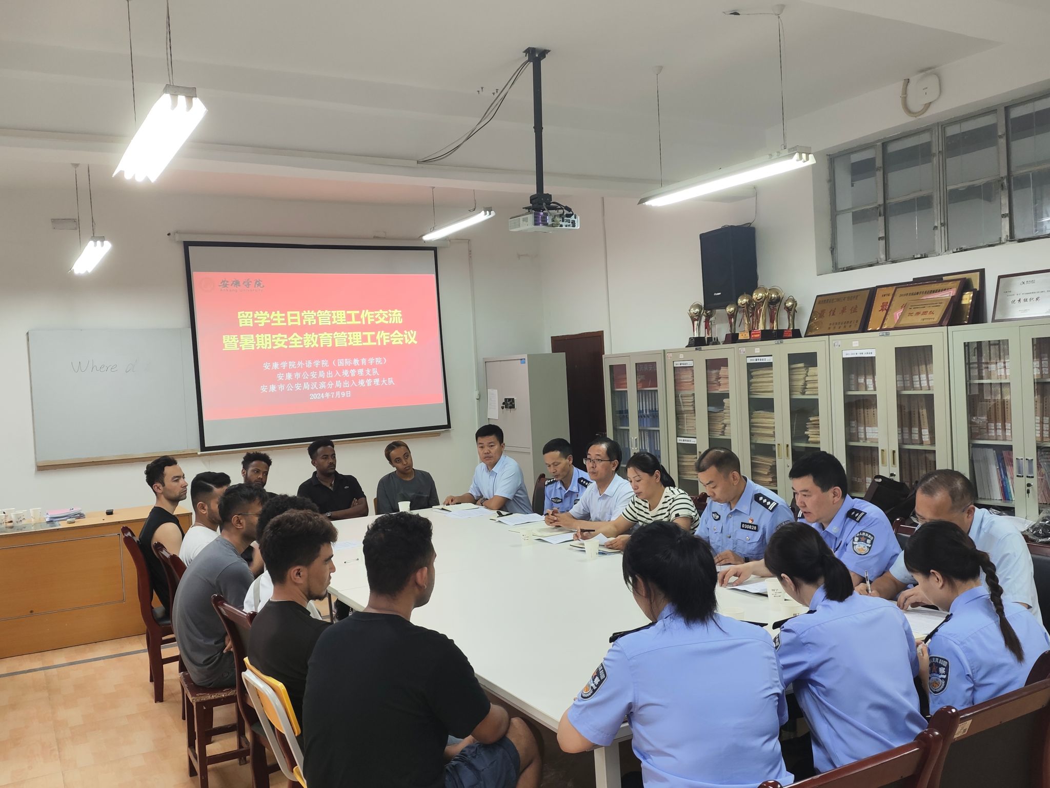 为进一步加强来华留学生教育管理,营造安全和谐校园氛围,7月9日上午,安康市公安局出入境管理支队、汉滨分局出入境管理大队一行六人到开元官网开展留学生管理调研交流座谈。安康市公安局出入境管理支队长陈从兵、汉滨分局出入境管理大队长周云平、外语学院(国际教育学院)院长张哲华、党总支书记肖红香、双方单位管理干部及全体在校留学生参加交流。座谈会由肖红香主持。