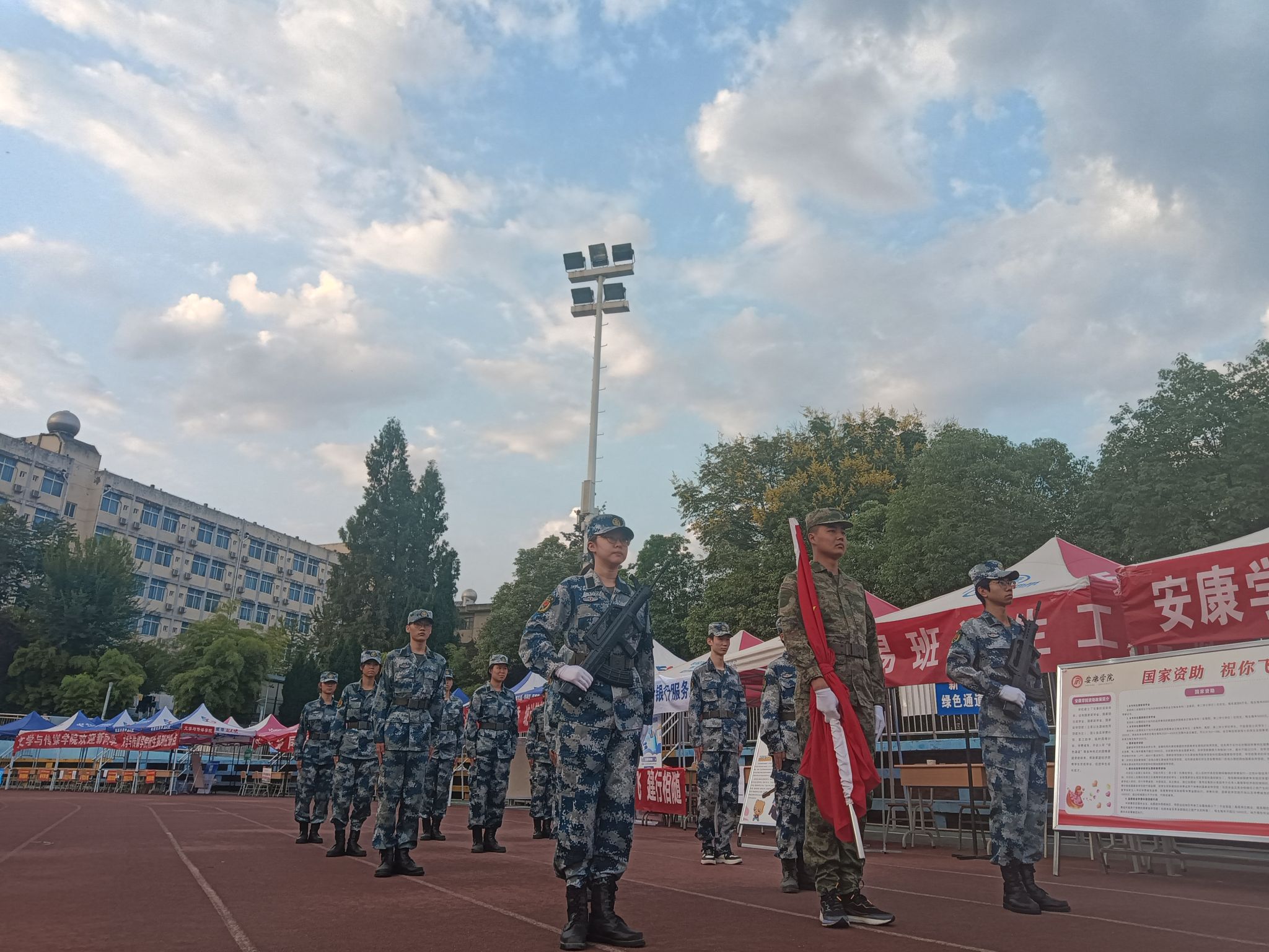 新学期伊始,校团委联合数统学院和电信学院在江南、江北校区开展了新学期升国旗活动。活动回顾了抗日战争的峥嵘历史岁月,勉励开元官网青年学子要把浓浓的爱国热情融入到学习生活中,用实际行动践行“强国有我”的时代强音。