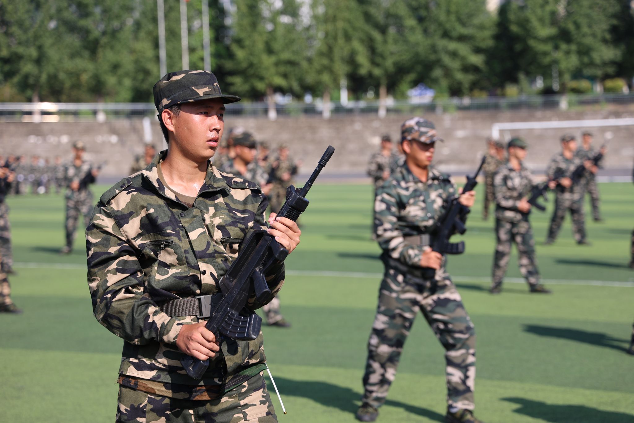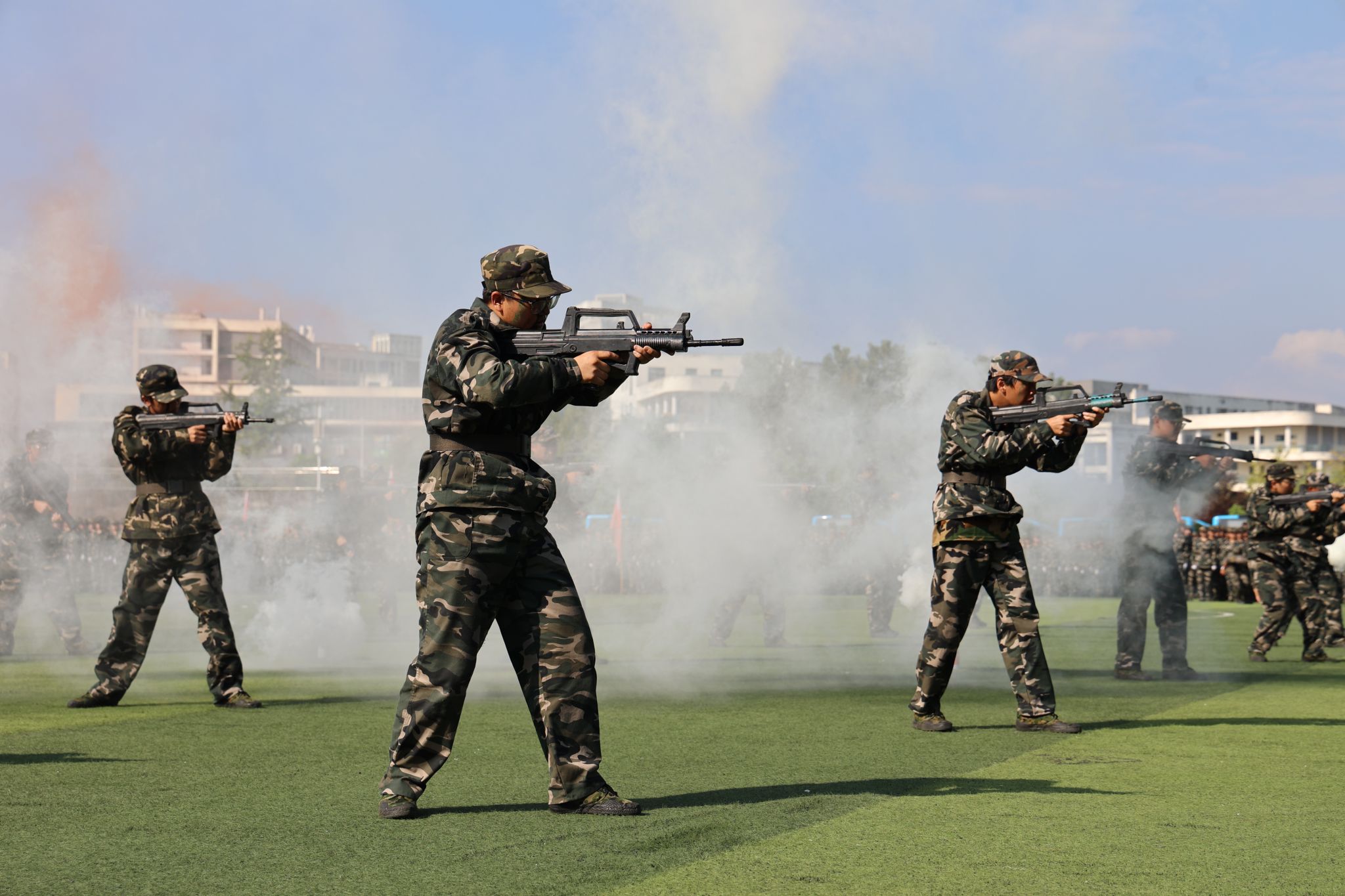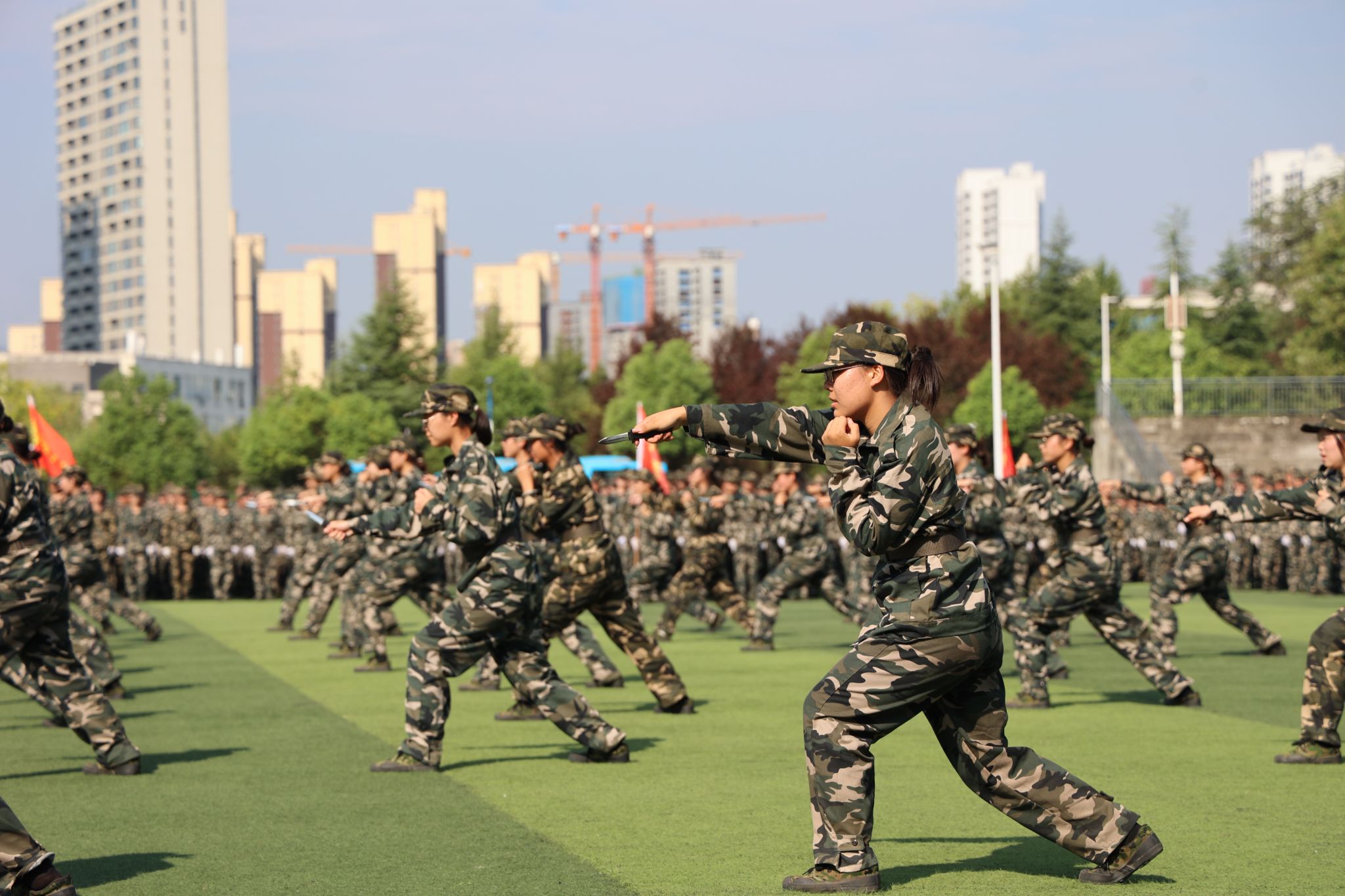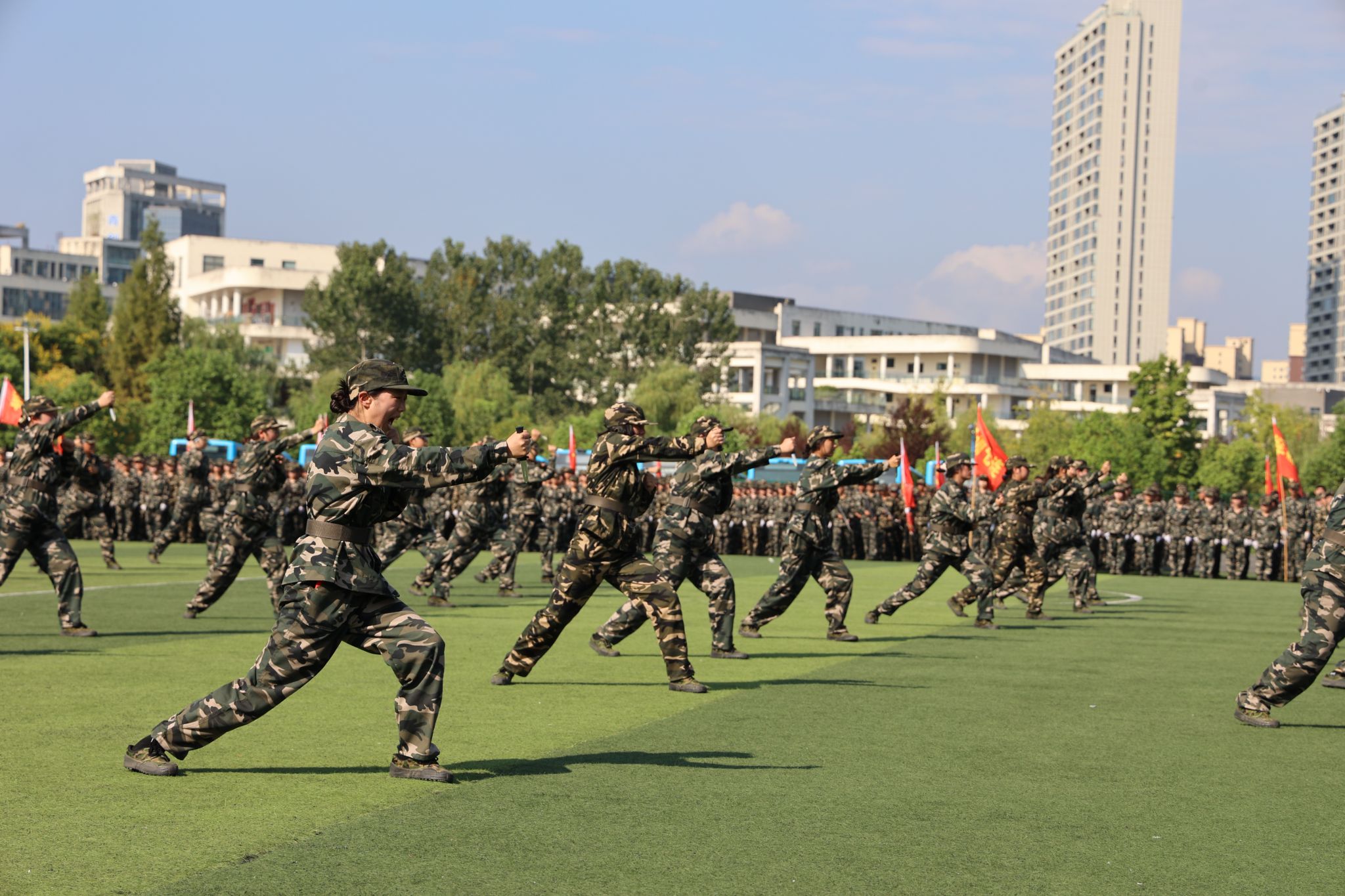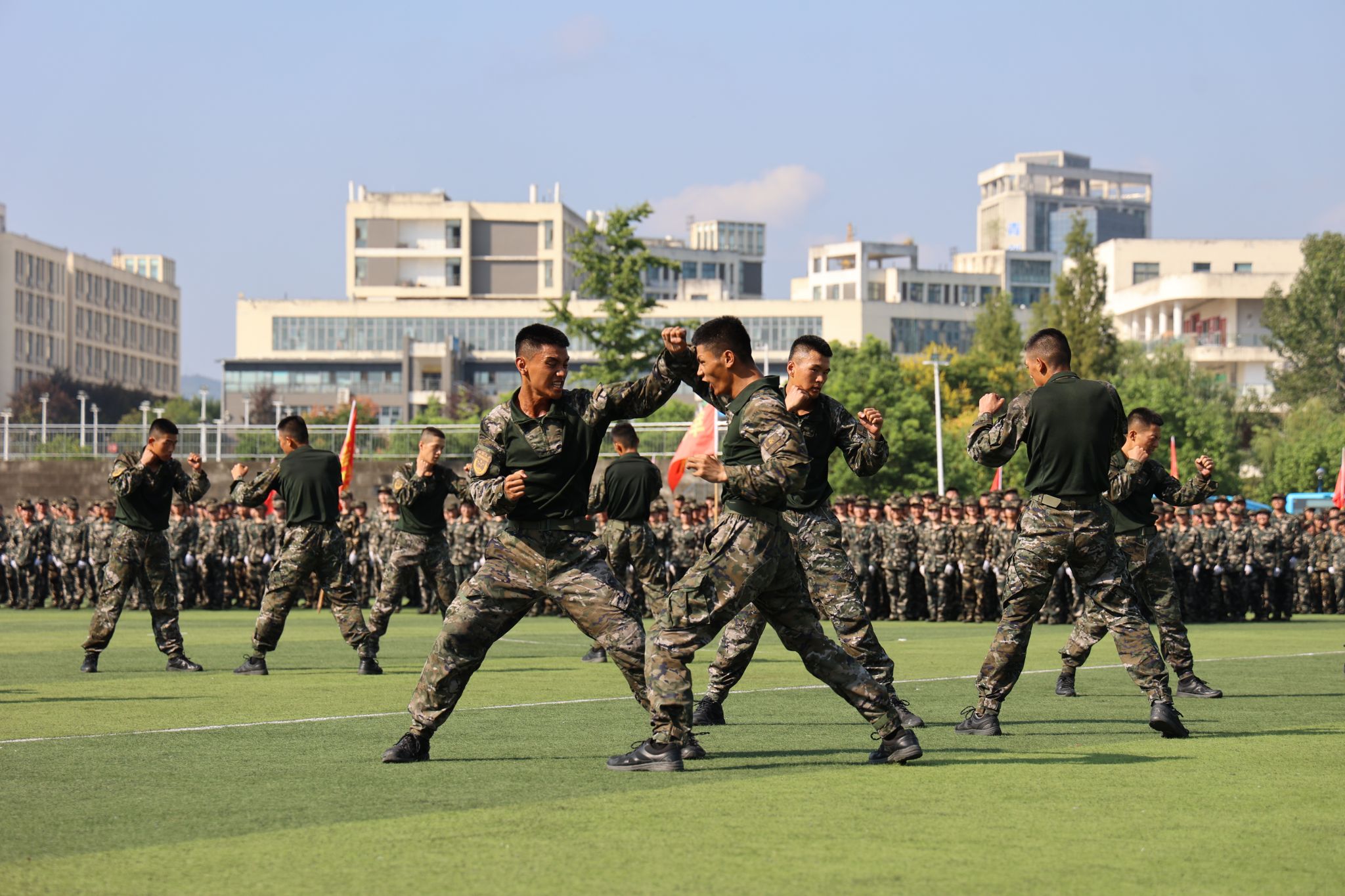 在庄严的国歌声中,大会拉开帷幕。安永强宣布2024级新生军训总结表彰大会正式开始。30个军训连队以自信的姿态和昂扬的斗志依次走过主席台进行分列式表演并接受检阅。汇演中新生们带来了刺杀、匕首操、战术等节目、教官表演了虎虎生威的格斗拳。他们规范的动作、整齐的步伐、响亮的口号、饱满的热情赢得了现场观众的阵阵掌声,充分展示了此次军训成果,彰显了军人的豪迈与力量。