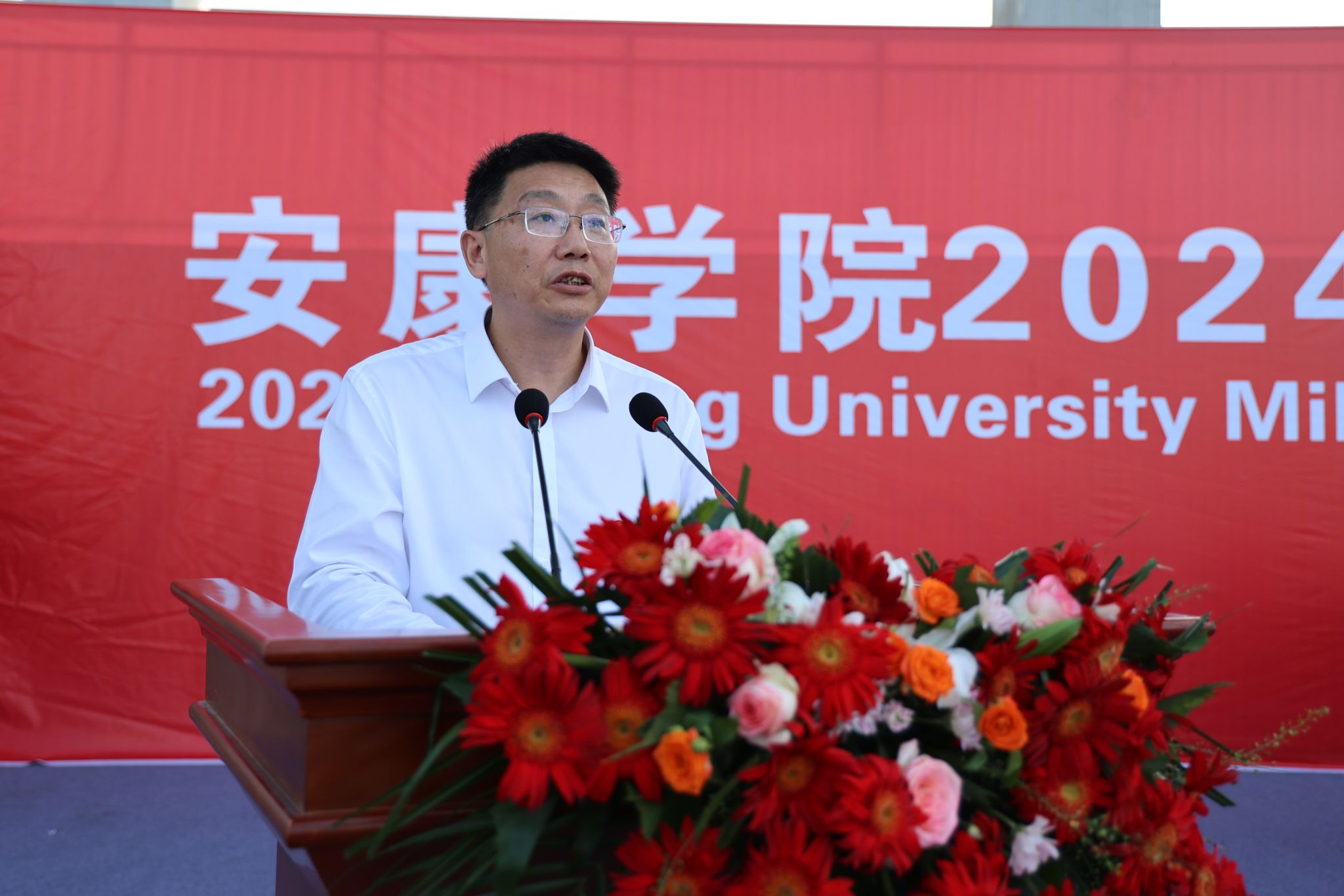张东红在大会上作总结讲话。他代表学校向全体教官、随训教师连日来辛勤的工作表示衷心感谢,向圆满完成军训任务、在军训中取得优异成绩的全体同学表示热列祝贺!他讲到,军训期间教官们严格要求、以身作则、悉心施教,充分彰显了新时代人民军队的良好形象和优良作风,为师生树立了学习的榜样;同学们严格遵守军训纪律,认真完成训练科目,以实际行动诠释了意志坚强、团结协作、服从指挥的优秀品质,圆满完成步入大学的“第一课”。同时,他向全体学生提了三点希望:一要坚定理想信念、立鸿鹄之志,用梦想指引青春航向;二要铭记“笃学、尚行、砺志、创新”校训,锤炼高尚品格,用真才实学续写人生精彩故事;三要勇于开拓创新、矢志艰苦奋斗,让创新成为青春最亮丽的代言,让奋斗成为青春最厚重的底色,努力成为走在时代前列的奋进者、开拓者、奉献者,为实现中华民族伟大复兴贡献青春力量。