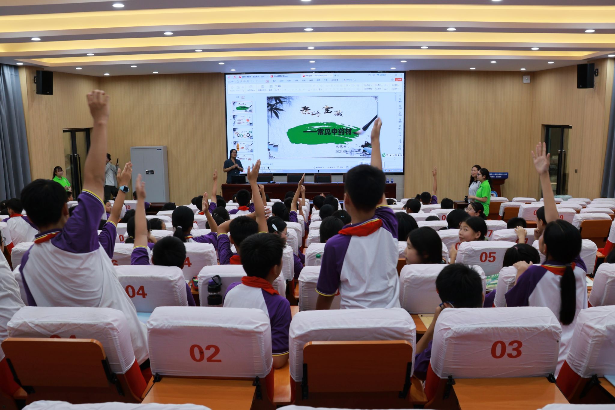 在“秦岭宝藏——常见中药材”主题活动中,花俊丽博士围绕秦岭天麻、杜仲、五味子、金银花和黄连等药材,向学生介绍了这些药材的药性、功效、主治和实用偏方等内容。学生们通过了解不同药材的气味、性状、质地和特性,体验了杜仲皮和叶子“藕断丝连”的特点。在“秦地无闲草”抢答活动中,学生们积极参与,现场气氛活跃。
