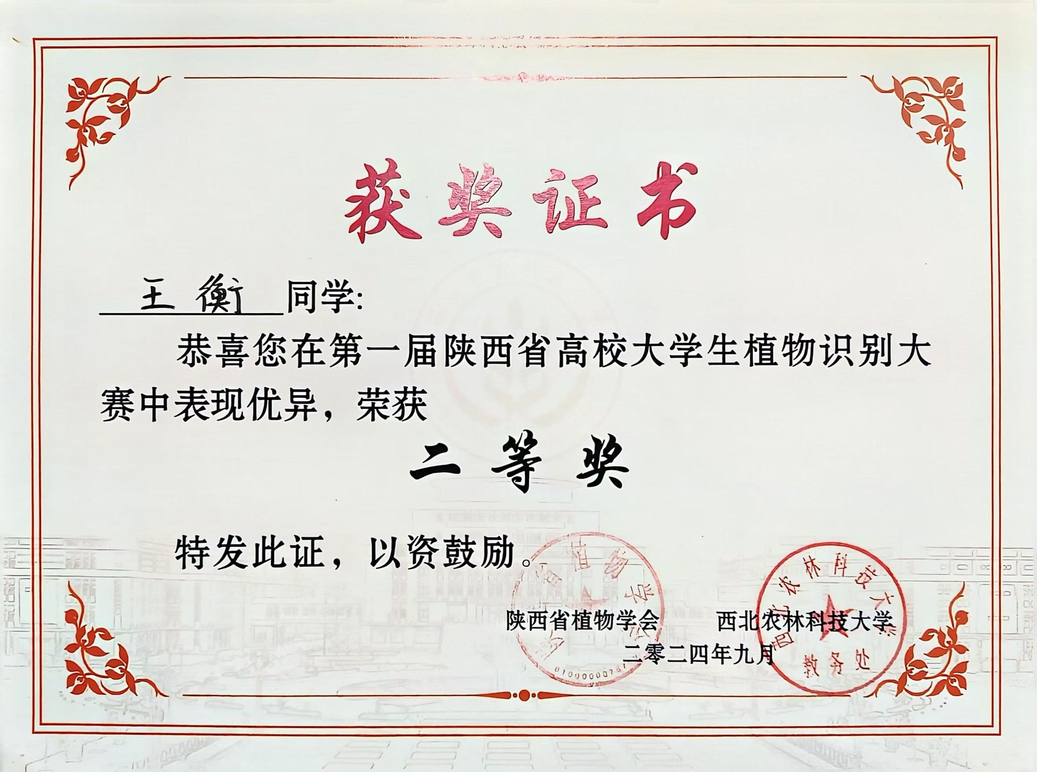 近日,第一届陕西省高校大学生植物识别大赛在西北农林科技大学博览园成功举办,开元官网农生学院2023级园林专升本班学生王衡喜获大赛二等奖。
