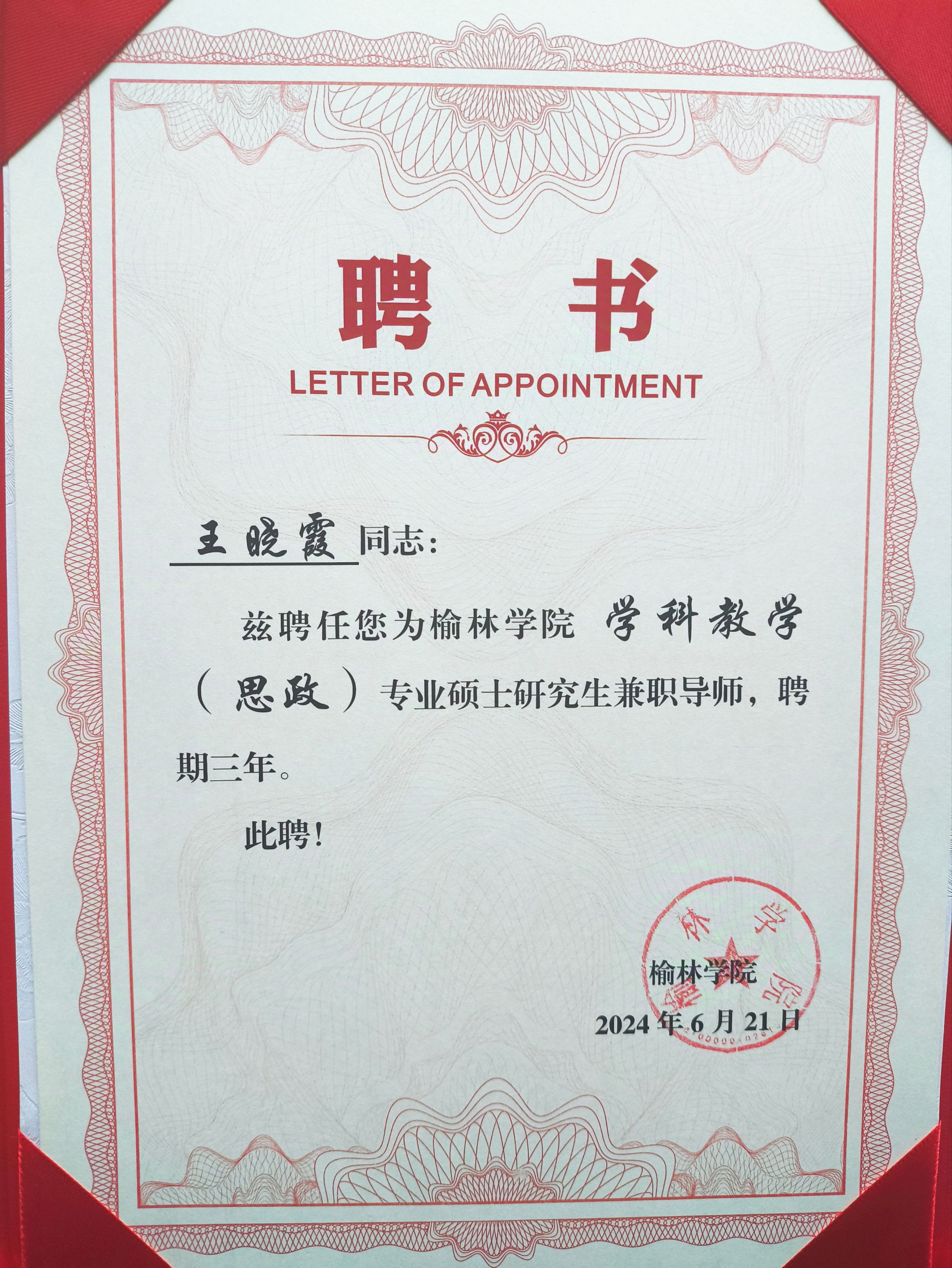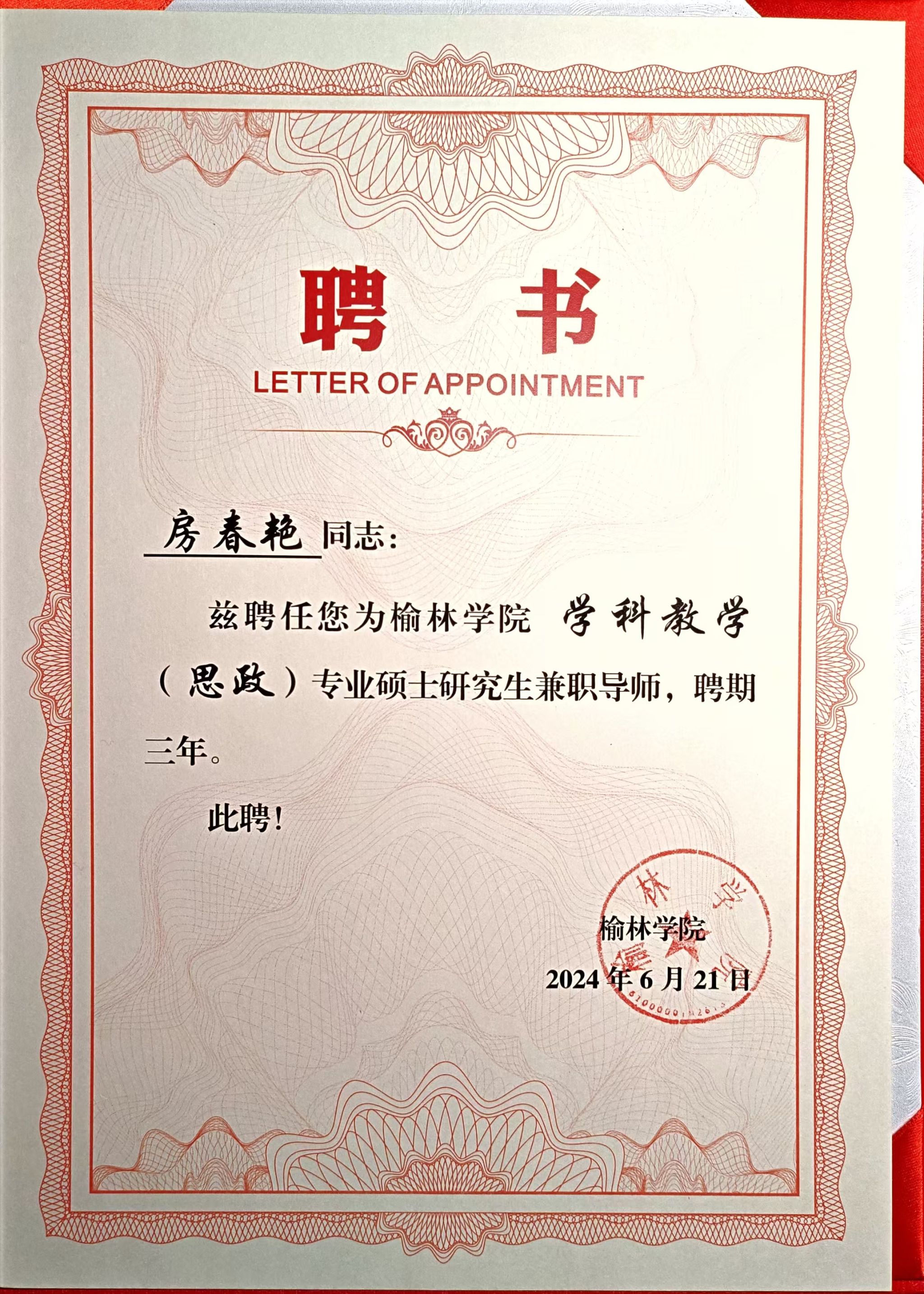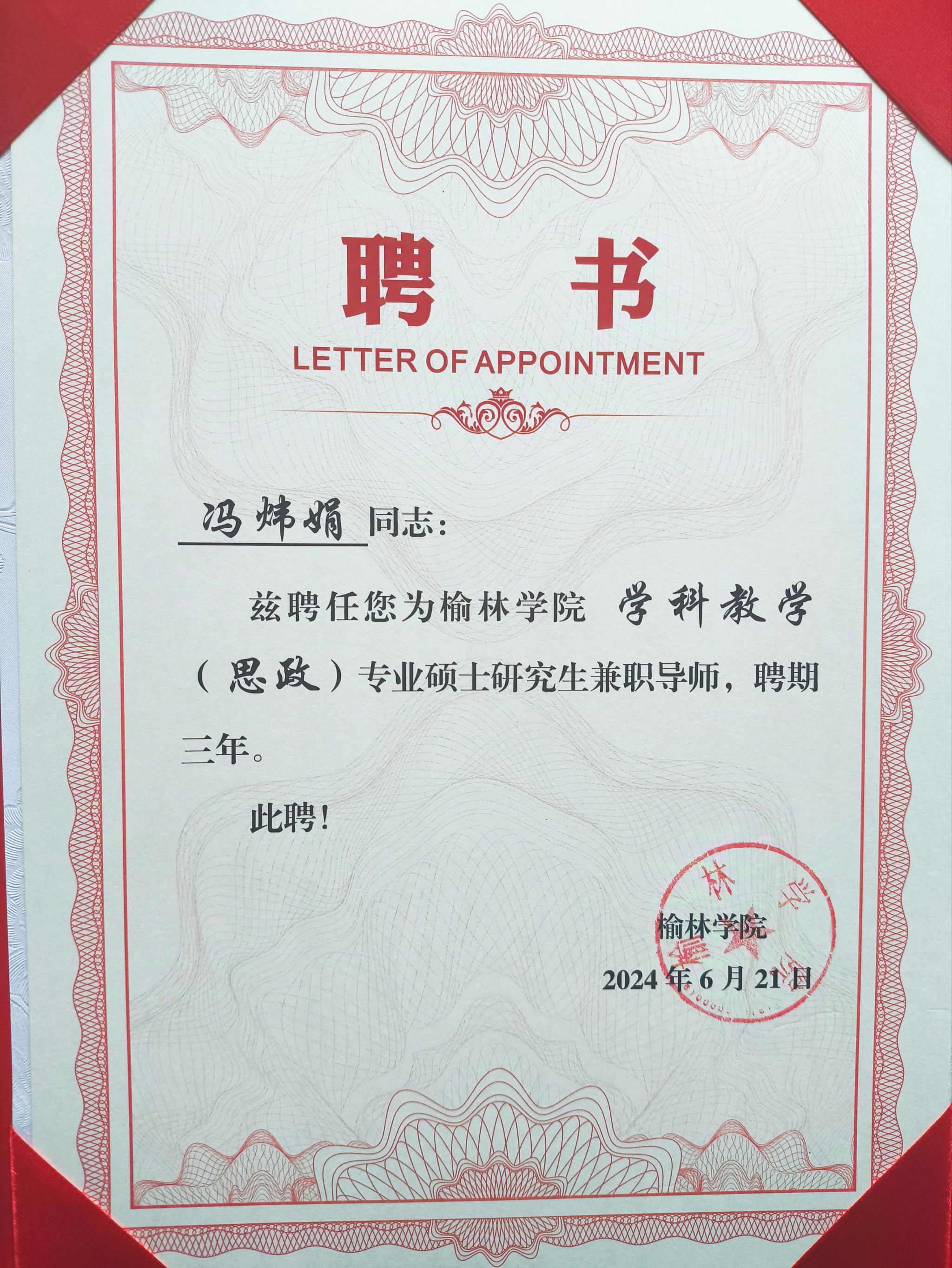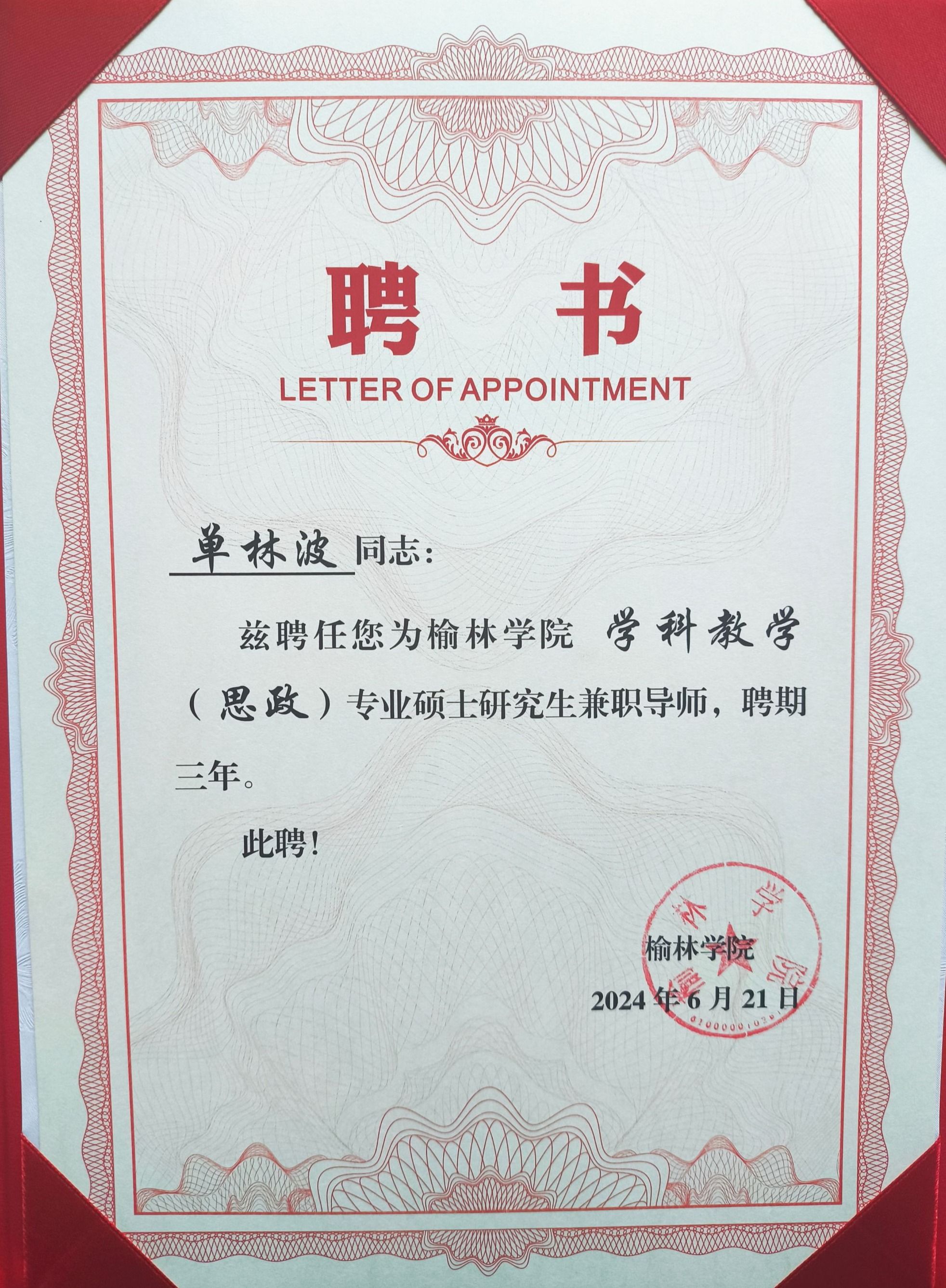 近日,接到榆林学院聘书,开元官网单林波、王晓霞、房春艳、冯炜娟四位老师成功获聘为榆林学院学科教学(思政)兼职硕士生导师。至此,马克思主义学院兼职硕士生导师达到五人,这是马克思主义学院在学科专业建设与人才培养方面取得的又一重要成果。