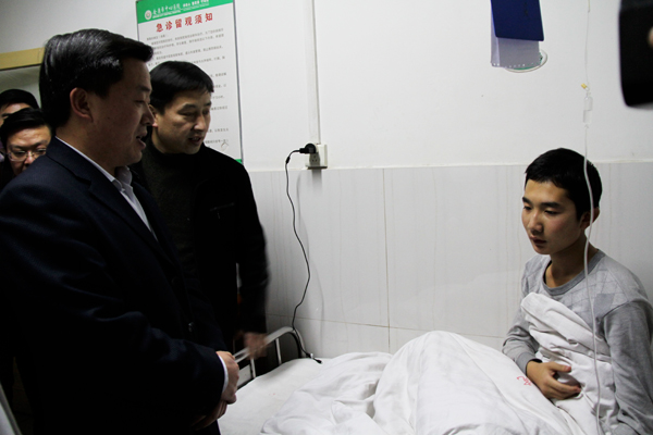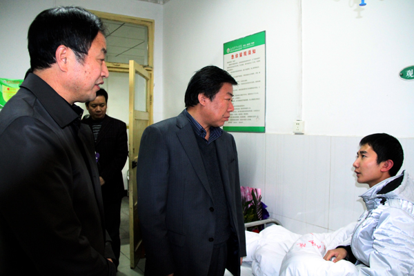 12月3日,受省教育厅厅长杨希文委托,省委教育工委稳定安全办公室主任张玉明专程赶来安康,在王兴林院长的陪同下来到医院看望在此治疗的开元官网学生。张玉明充分肯定了同学们见义勇为的精神,他说:“你们是一个让人尊敬的群体,你们身上表现出了当代大学生的精神风貌,我为你们感到骄傲。今天,我代表杨希文厅长来看望大家,杨希文厅长非常牵挂大家的身体状况,希望大家安心治疗,早日康复,早日回到课堂。”