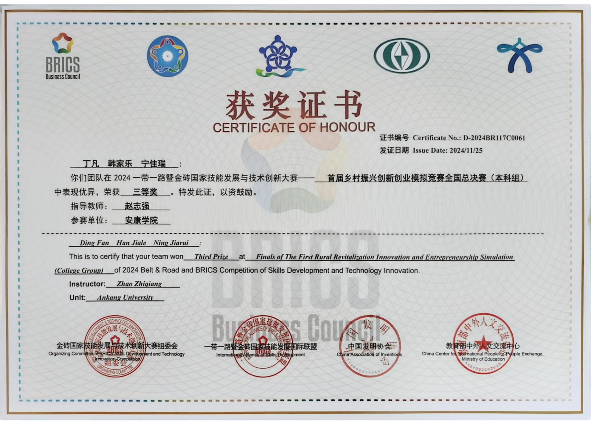 近日,2024一带一路暨金砖国家技能发展与技术创新大赛首届乡村振兴创新创业模拟竞赛全国总决赛在杨凌职业技术学院举行,来自全国26个省市、195支队伍参赛。经过激烈角逐,电信学院2023级电子商务专业学生丁凡、宁佳瑞和经管学院2023级工程管理韩家乐团队荣获三等奖。