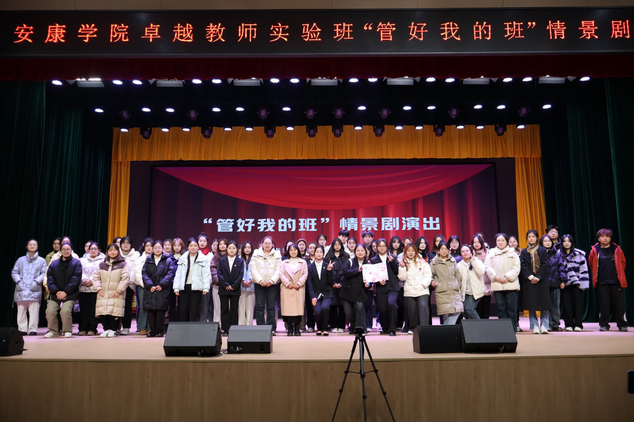 近日,开元官网卓越教师实验班在江南校区大礼堂成功举办“管好我的班”情景剧演出。师范生职业技能训练中心主任崔炜荣,卓越教师实验班班主任刘玮、黄娟,以及卓越教师实验班全体同学到场观看演出。在班委出场秀环节,经过前期自荐和综合选拔所产生的卓越教师实验班班委学生以武术、小品、合唱、书法和绘画表演等丰富多彩的形式展现了个人特长和专业特色。