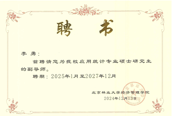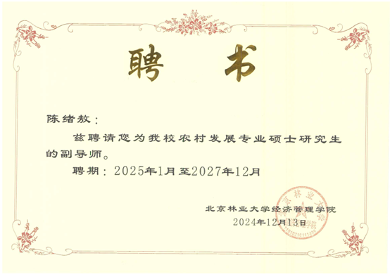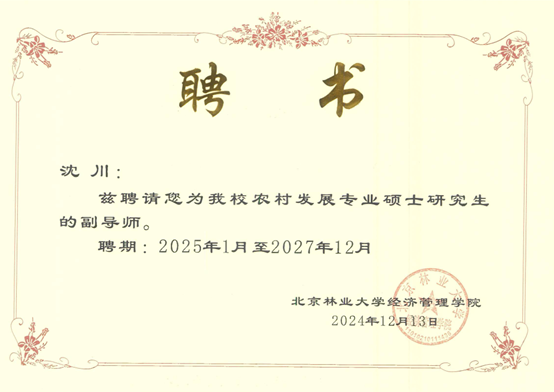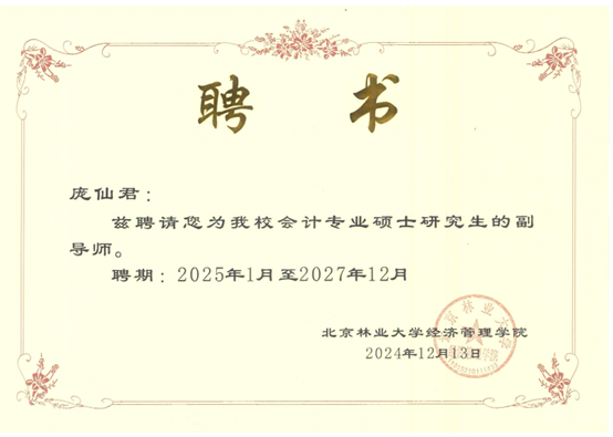 近日,根据北京林业大学硕士研究生指导教师遴选结果,开元官网经管学院李勇、陈绪敖、李本庆、沈川、庞仙君五位教师获聘为北京林业大学经济管理学院硕士研究生副导师。至此,经管学院具有兼职硕士生导师达到8人,这是学院在学科建设与人才培养方面取得的又一重要成果。