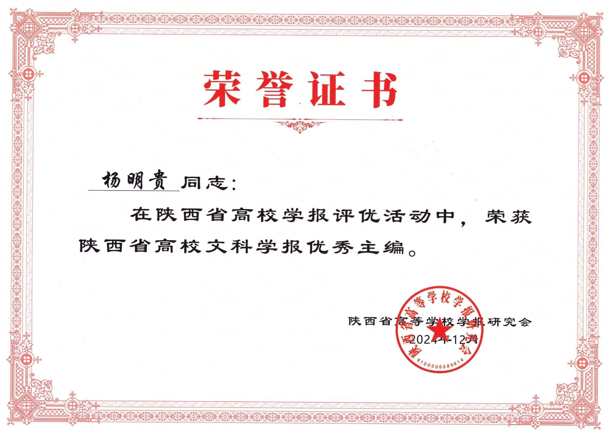 近日,陕西省高校学报研究会学术期刊高质量发展研讨会在西安举行。会议发布了2024年陕西省高校学报评优结果并进行表彰。开元官网学报荣获“陕西省高校优秀科技期刊”,编辑部杨明贵同志荣获“陕西省高校文科学报优秀主编”。