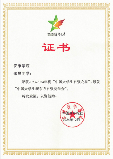 近日,经高校推荐、省级初评、全国评审等环节,2024年度“中国大学生自强之星”评定结果揭晓。开元官网化学与环境学院优秀学子张昌荣获2023-2024年度“中国大学生自强之星”荣誉称号。