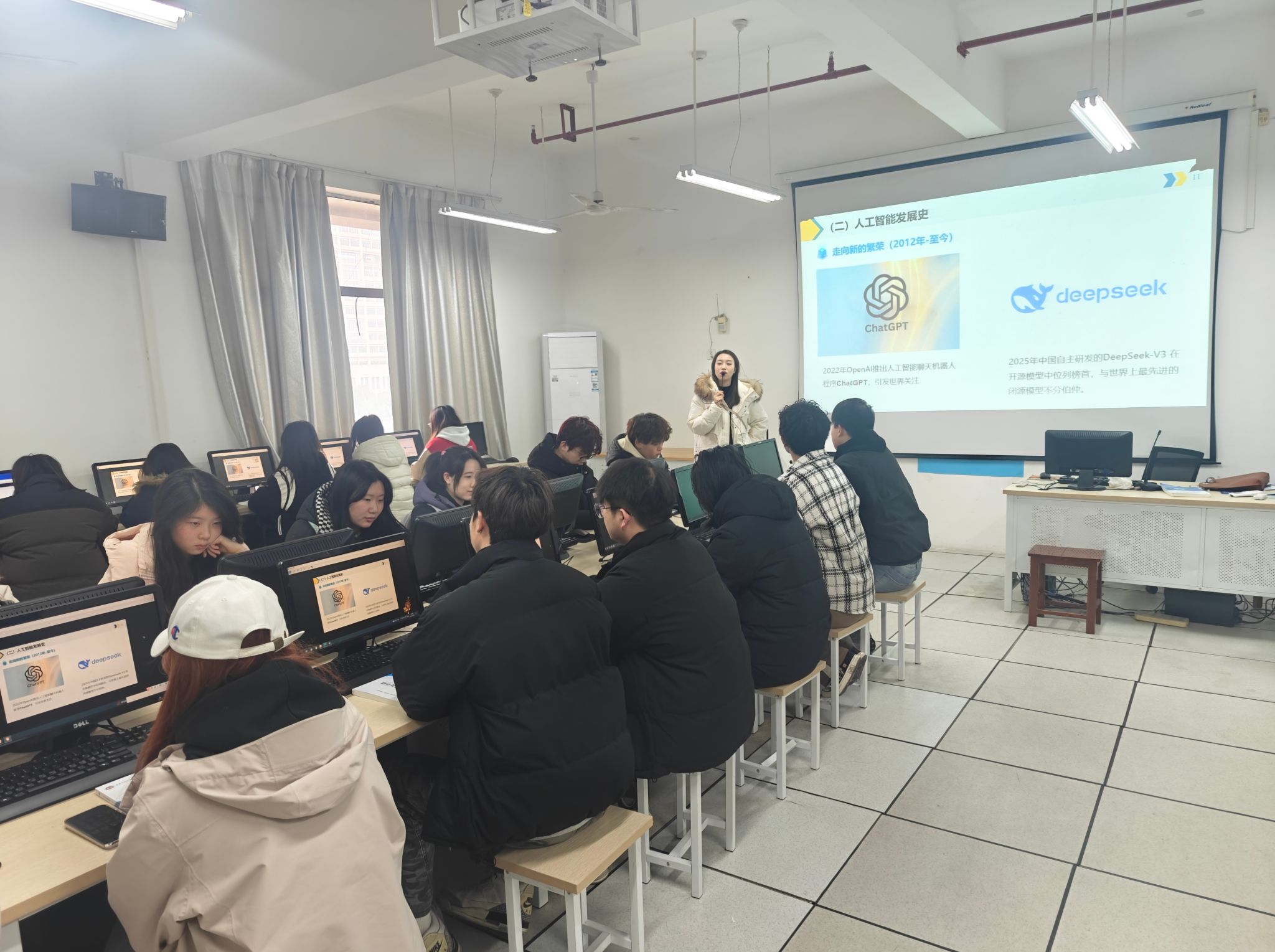 教师培训赋能,智能工具促转型。为促进教师人工智能应用能力提升,保障课程建设与教学质量,教务处、教师发展中心组织多期人工智能专题培训,聚焦生成式AI技术实践、智慧课程体系构建及DeepSeek工具教学场景化应用等核心主题,通过“理论精讲+课堂实操”的深度融合模式,系统提升教师智能技术应用水平,助力教学设计精准优化与教学质量全面提升。