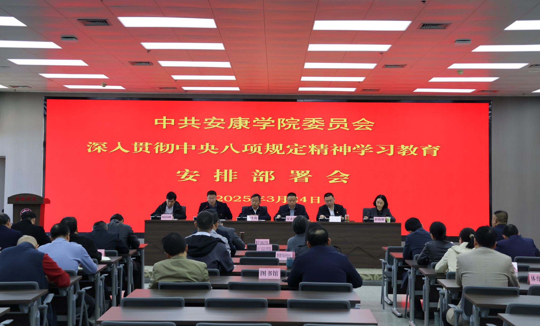 3月24日,学校在江南校区图书馆六楼报告厅召开深入贯彻中央八项规定精神学习教育安排部署会。在校校领导、党委委员、二级党组织负责人、二级学院院长以及职能部门负责人参加了此次会议。会议由党委副书记、纪委书记、监察专员安永强主持。