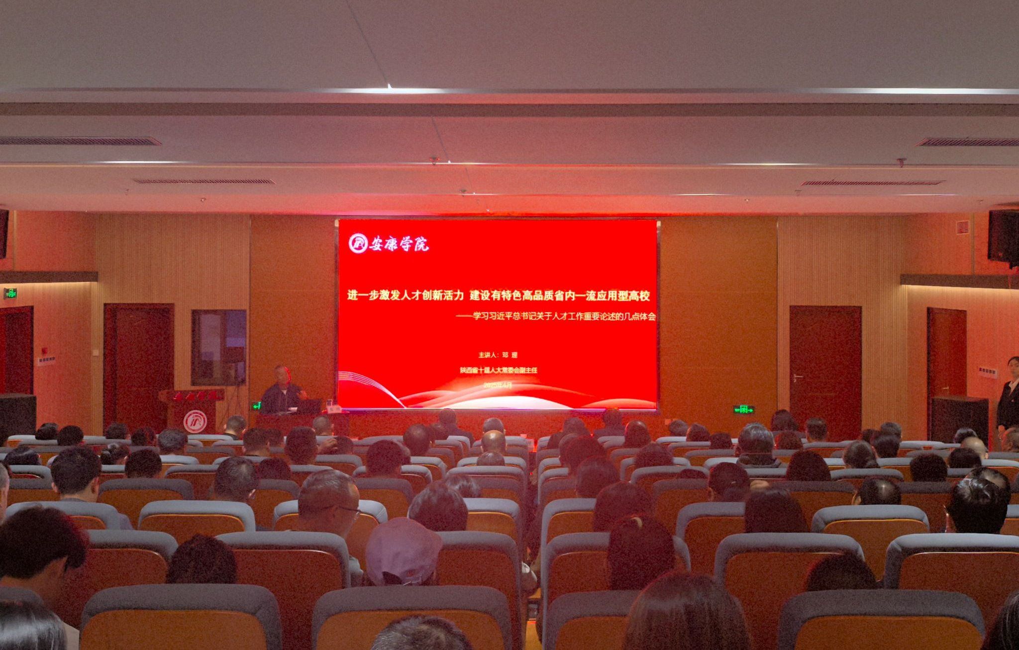 4月7日下午,陕西省第十届人大常委会副主任邓理应邀来校,在江北校区图书馆学术报告厅作题为《进一步激发人才创新活力,建设有特色高品质省内一流应用型本科高校——学习习近平总书记关于人才工作重要论述的几点体会》的专题学术报告。学校党委书记钟生海,校长余劲,党委副书记、纪委书记、监察专员安永强,党委副书记张东红、余谦,副校长崔晓明及全校副处级以上干部、博士教师代表等现场聆听,共同学习人才工作新理念、新路径。报告会由校长余劲主持。