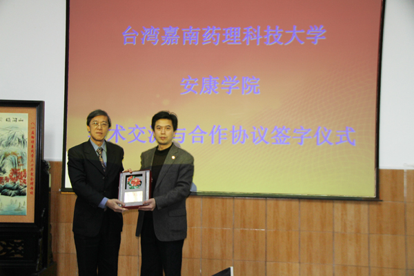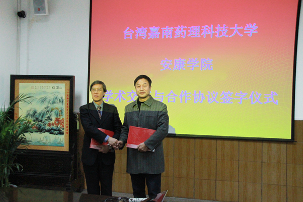王兴林、陈铭田代表各自学校签署了合作办学协议。格局协议约定,双方将互派教师进行培训和工作交流;在科研及文化交流等方面开展有效合作。一是加强教师之间的交流。双方互派教师进行学术交流、学习,以使各自的办学思想、模式、具体措施得以充分交流。二是合作办学。采用“1+2”或“2+1”模式。我院学生在校学习1(或2)年后,到嘉南药理科技大学继续学习2(或1)年。三是“交换生”项目。利用假期,选派一定数目的交换生到嘉南药理科技大学进行教学参观和专业技能操作训练等,以增长知识、拓宽眼界。四是科研项目的合作。双方积极开展应用型科学研究的合作。