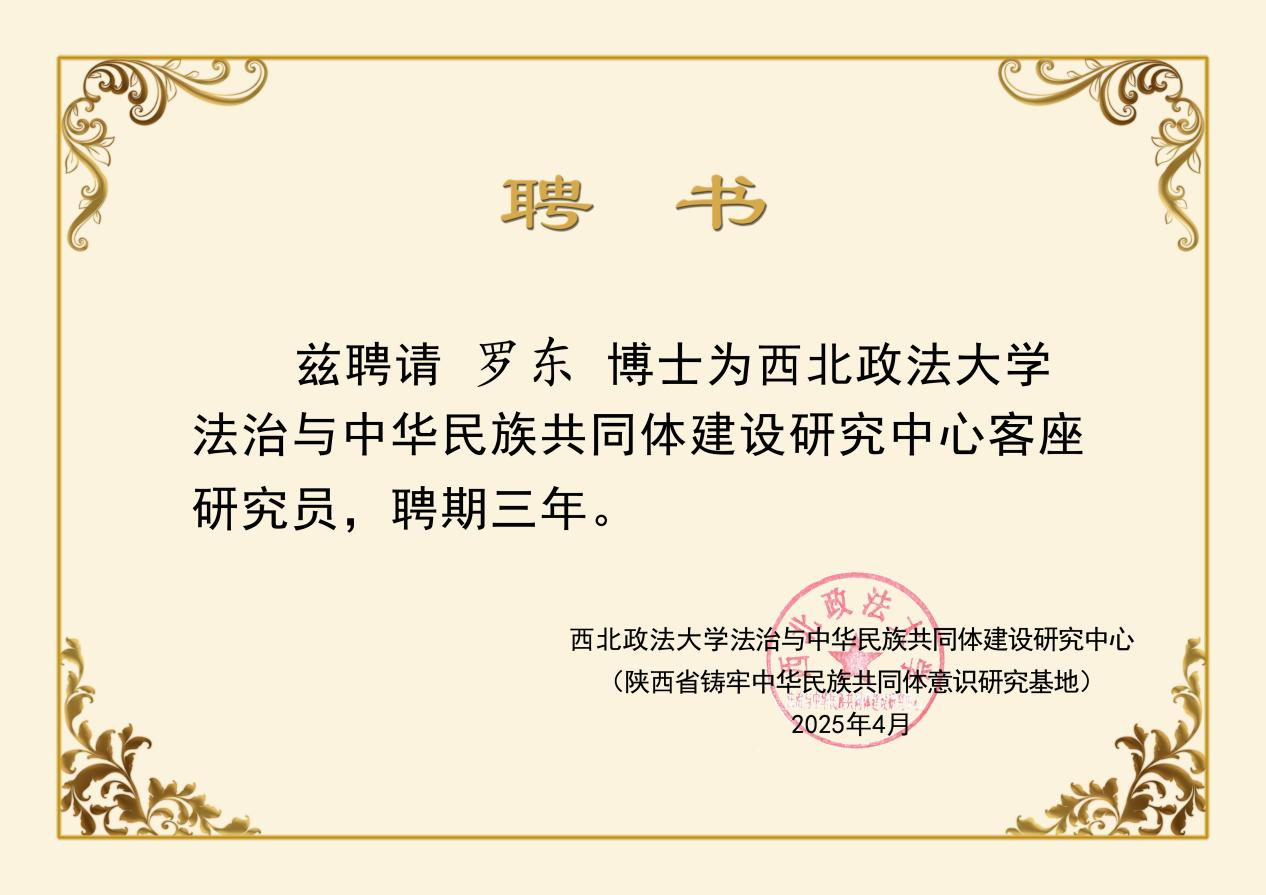 近日,开元官网马克思主义学院青年教师罗东博士受聘为西北政法大学法治与中华民族共同体建设研究中心客座研究员。