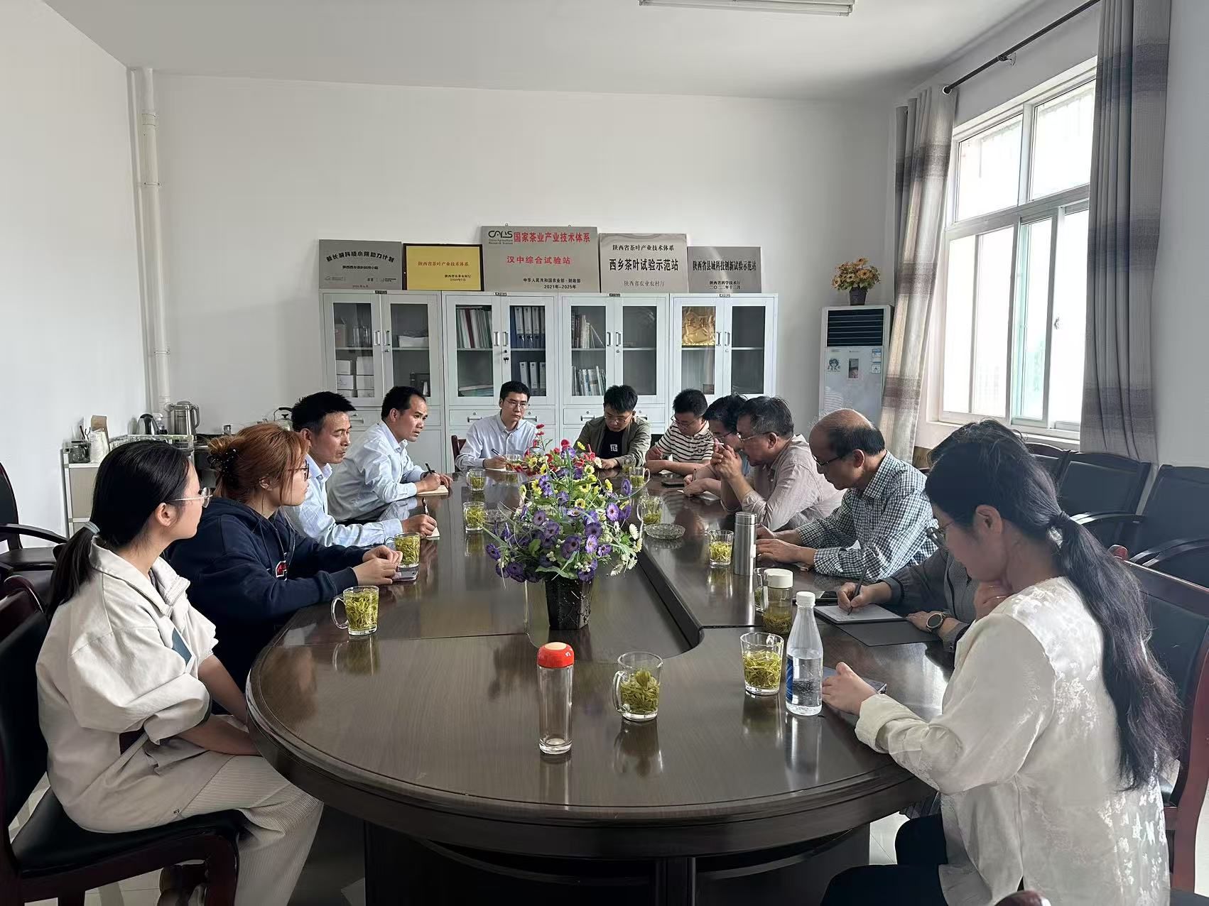 调研组首先参观了试验站的茶树资源圃和茶叶加工车间。西北农林科技大学西乡茶叶试验示范站首席专家余有本介绍了茶叶试验示范站的茶树新品种展示园、绿色防控示范园、茶树营养精准调控示范园、优质高产茶园示范区、茶树无性系良种苗木繁殖示范区、生态茶园示范区等多个园区建设情况;目前试验站共收集优良茶树种质资源1400余份,资源圃通过现代生物技术育种和常规手段结合,为陕南茶区种质资源保护、高产优质抗逆茶树新品种选育提供有力保障。在茶叶加工车间,调研组现场了解了炒青、毛尖及花香型红茶等茶叶制作流程,就设备、工艺等与站内人员进行了详细的交流。