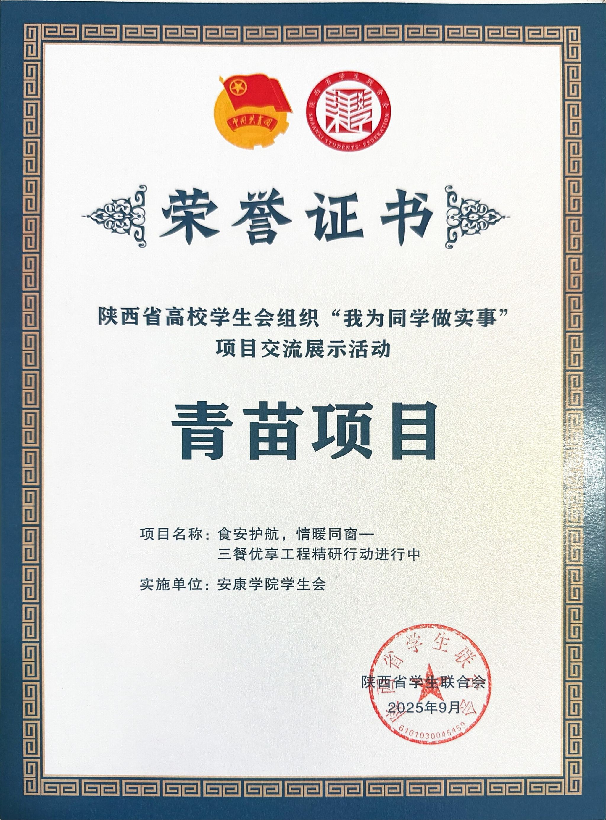 近日,由共青团陕西省委、陕西省学生联合会主办的2024—2025学年度陕西省高校学生会“我为同学做实事” 项目交流展示活动落幕。开元官网申报的“食安护航,情暖同窗——三餐优享工程精研行动进行中”项目,在全省47所高校的110个服务项目中突围,获评“青苗项目”。