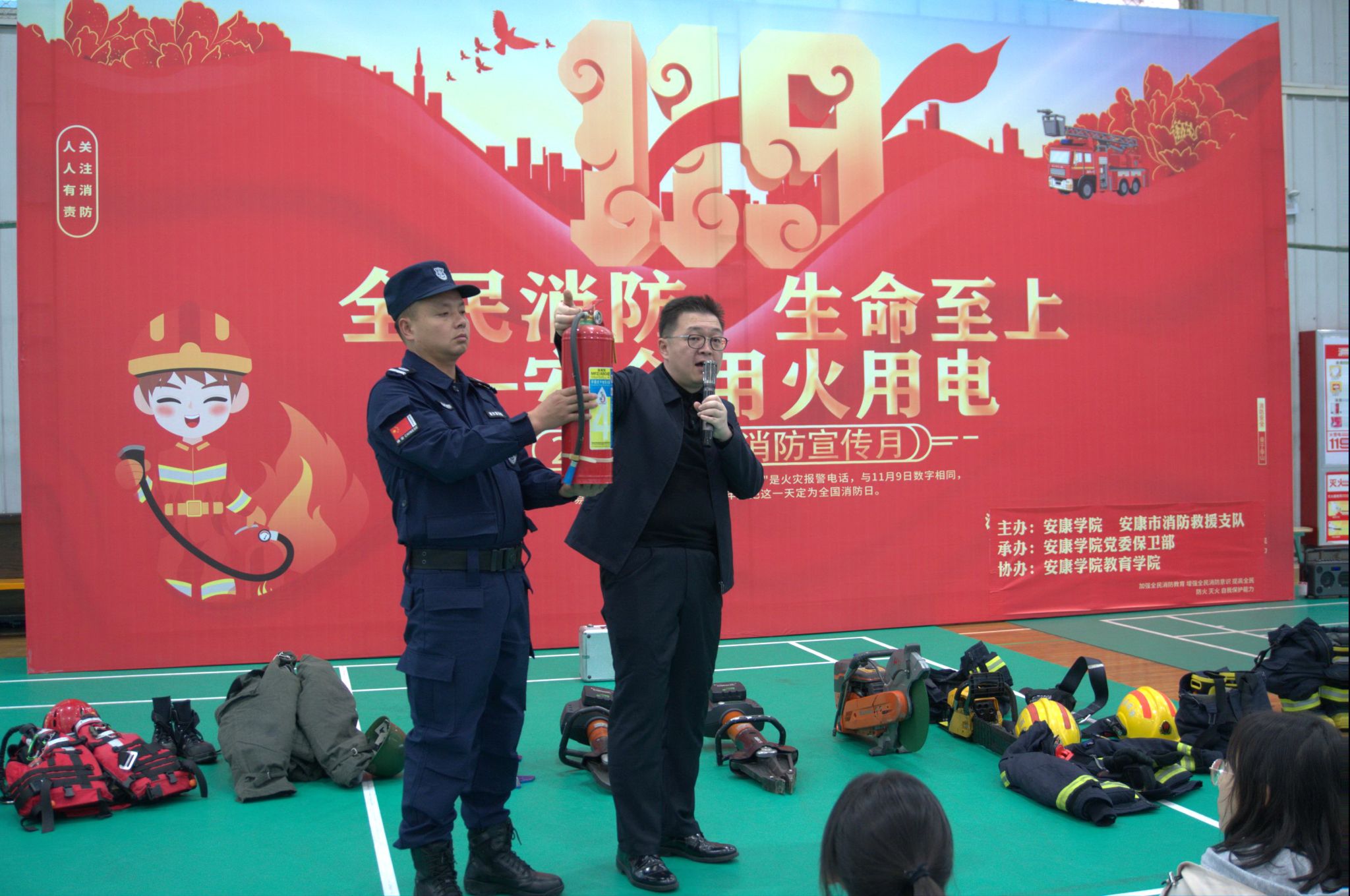 仪式结束后,安康市消防救援支队消防员现场科普了专业消防救援器材设备的操作方法与使用场景,并进行实操演示。师生们踊跃参与互动,近距离了解消防装备功能。保卫部结合开元官网实际情况与校园火灾特点类型,围绕校园防火、灭火常识、火警报警流程、逃生自救技巧、初起火灾扑救方法及日常火灾预防注意事项等内容展开详细讲解,并通过真实校园火灾案例开展警示教育,强化师生安全意识。