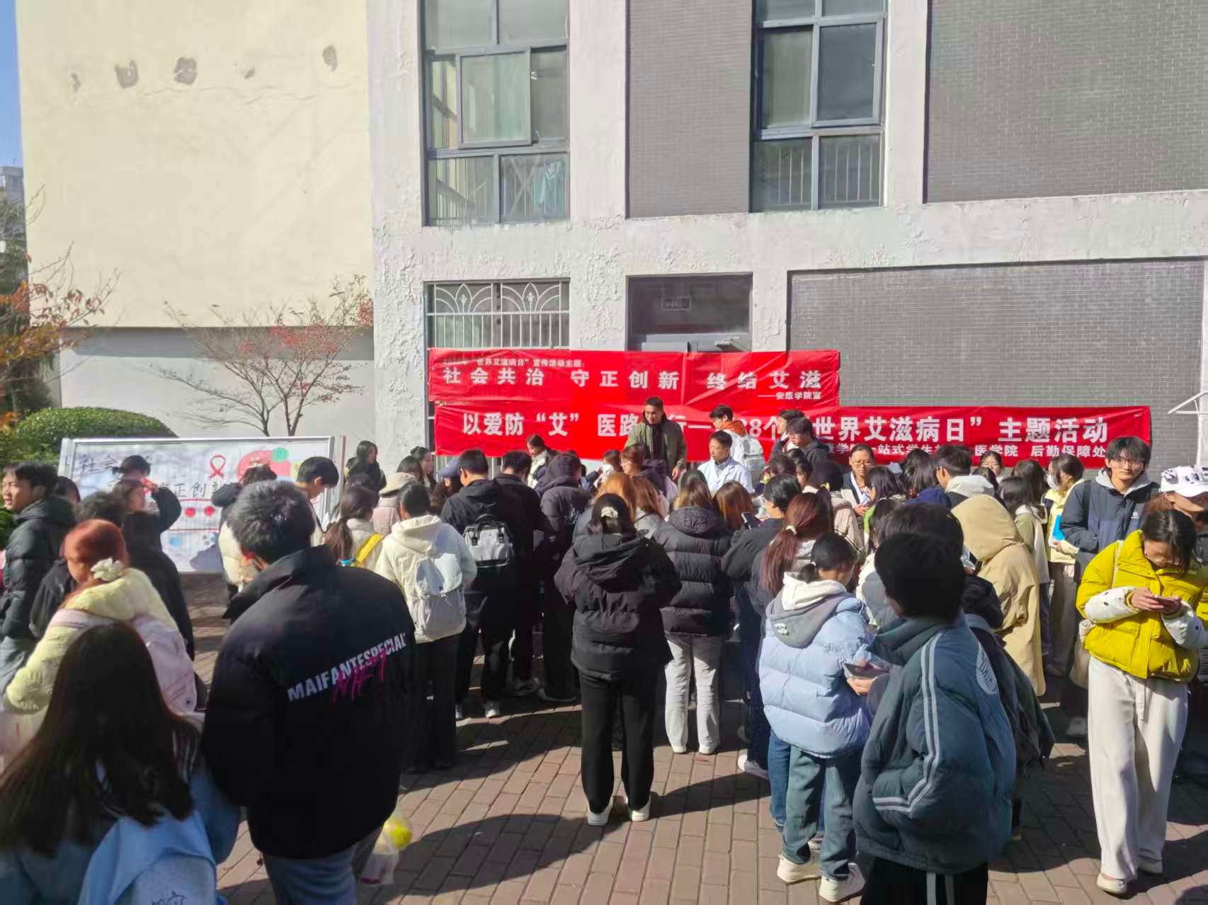 11月25日,江北校区学生活动小广场率先拉开活动序幕。“以爱防‘艾’,医路相行”主题团日活动气氛热烈,医学院志愿者们化身防艾知识传播使者,与同学们积极交流防艾见解。当日下午,江北图书馆报告厅内座无虚席,安康市疾控中心艾滋病科科长屈娅荣以“知爱防艾 我的青春我做主”为题带来一场精彩讲座。她结合真实案例与详细数据,深入浅出地阐释艾滋病的传播途径、严重危害及科学预防措施,现场互动频繁,学生踊跃提问,收获颇丰。活动期间,校医疗中心医护人员及志愿者还通过设置宣传展板、悬挂横幅、播放宣传视频、专人讲解及发放防艾宣传品、手册、红丝带和计生用品等多元形式,开展全方位、立体式防艾知识宣教。