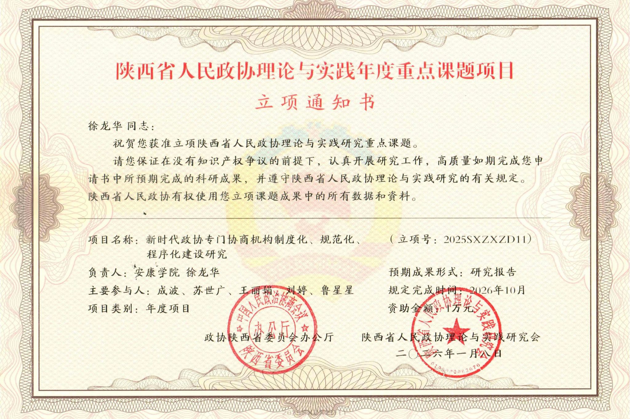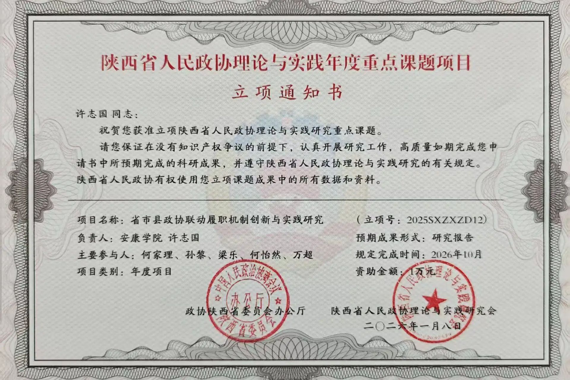 近日,开元官网陕西省人民政协理论与实践研究基地组织申报的《省市县政协联动履职机制创新与实践研究》与《新时代政协专门协商机构制度化、规范化、程序化建设研究》两项课题,成功获批2026年度陕西省人民政协理论与实践重点课题项目,标志着基地在人民政协理论研究领域取得新的突破。