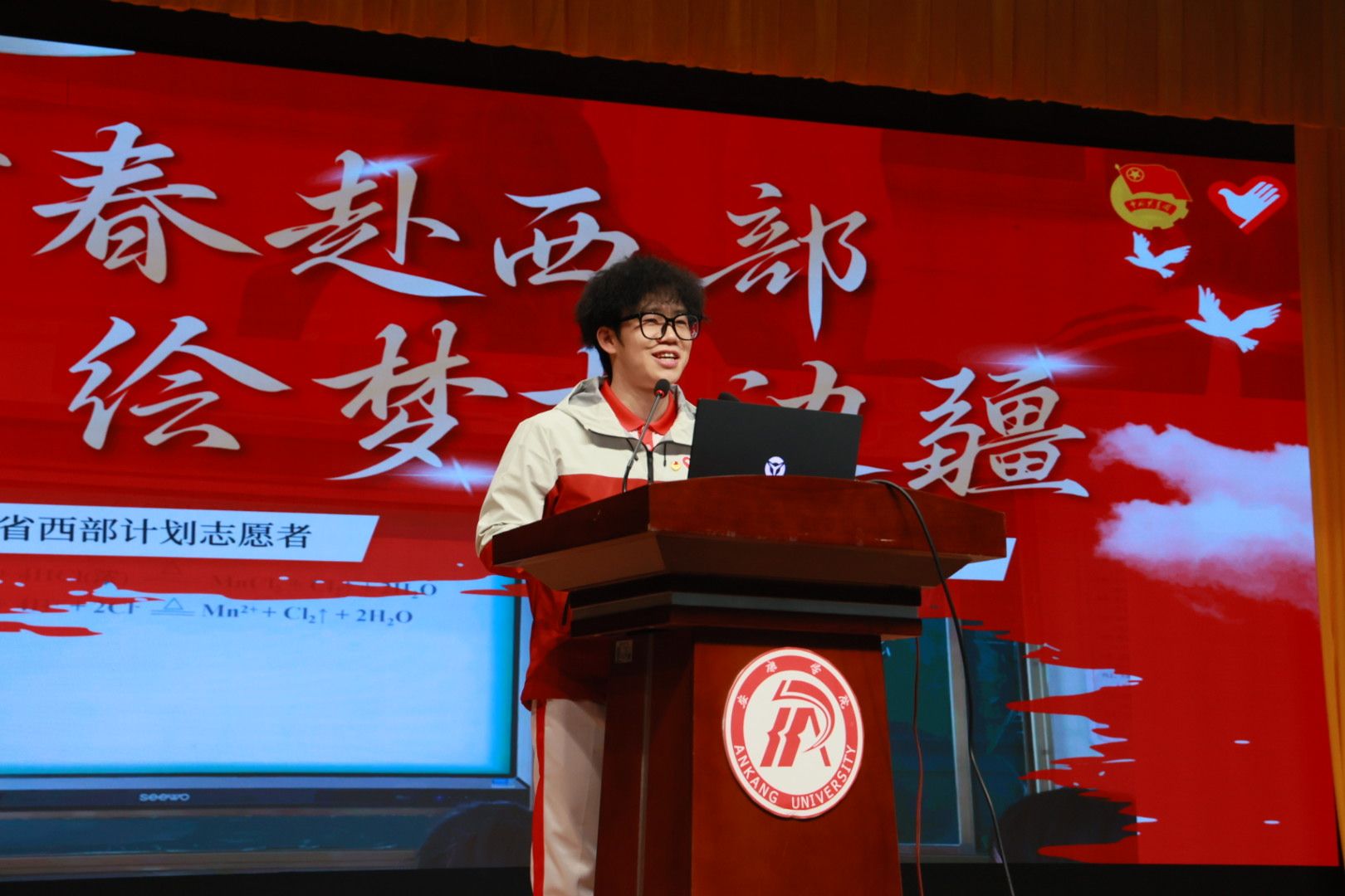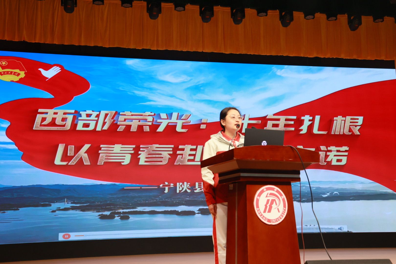 榜样领航:用青春书写西部答卷。在事迹分享环节,三位优秀西部计划志愿者代表深情讲述了扎根西部、服务基层的奋斗故事。程向颖回顾了他在新疆的支教经历。他从守护学生成长的“守护者”成长为引领学生前行的“引路人”,在教学一线深耕不辍,用实际行动践行着教书育人的初心使命。肖武群分享了从“学生气”到“接地气”的蜕变。她善用群众语言,聚焦留守儿童需求、推动开办社区托管班,以务实举措回应群众“急难愁盼”,彰显了基层志愿者的责任与担当。高婧芳讲述了自2016年以来扎根秦巴山区、服务满十年的心路历程。她从一名志愿者成长为基层骨干,以质朴情怀和坚韧韧劲,生动诠释了坚守与奉献的深刻内涵。三位志愿者的分享朴实真挚、催人奋进,让现场学子深切感受到新时代西部计划志愿者的使命与荣光。