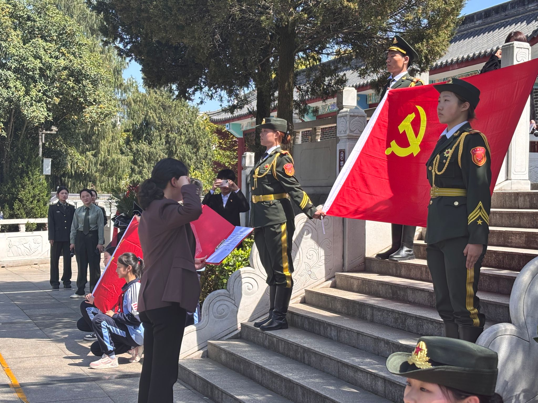 在“身份认同·党团队一体化传承”环节,党旗、团旗、队旗三面旗帜在烈士纪念碑前交相辉映。黄娟带领全体党员重温入党誓词,陈瑶带领全体团员重温入团誓词,市一小少先大队辅导员带领少先队员重温入队誓词。庄严的仪式感强化了政治启蒙的连续性,生动诠释了“入队、入团、入党是青年追求政治进步的‘人生三部曲'”,构建起贯穿全学段的思政育人链条。