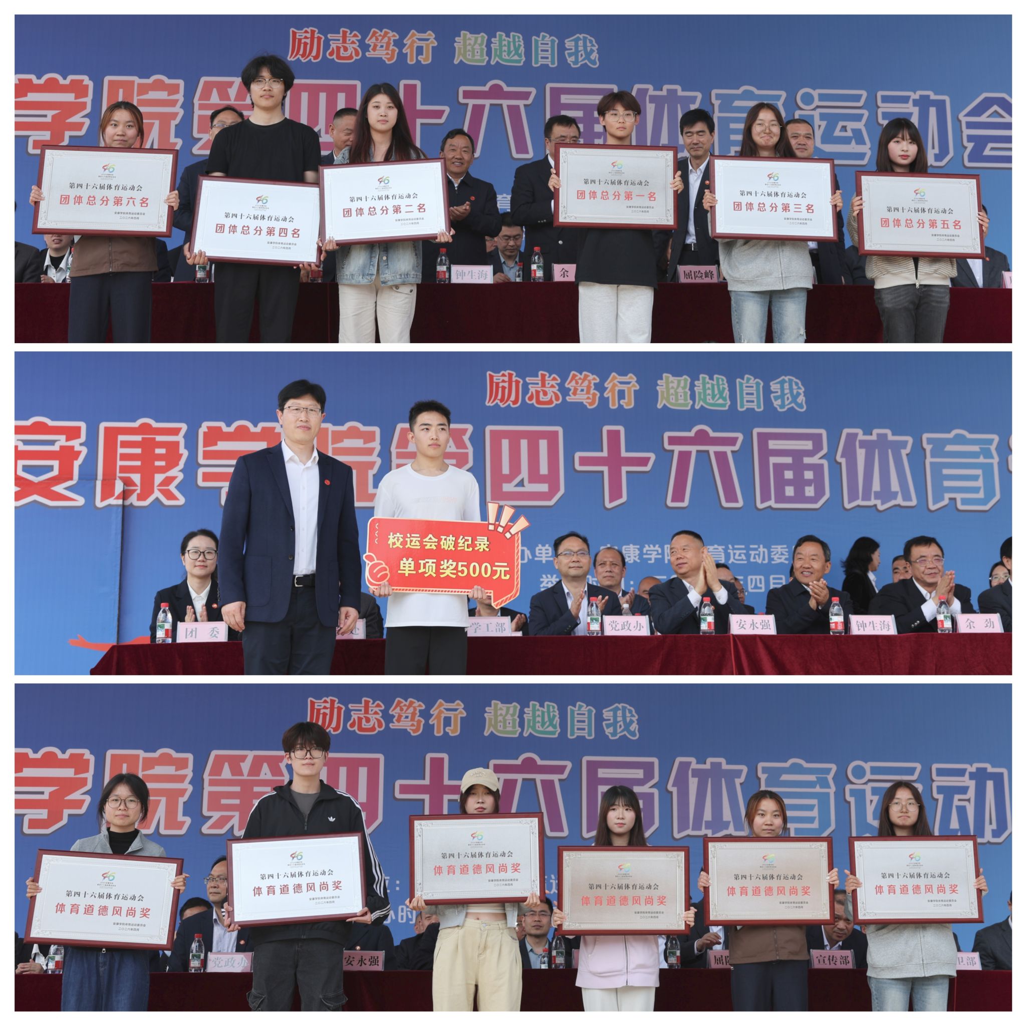 赛场上,全体运动员秉持“更快、更高、更强——更团结”的奥林匹克格言,恪守“友谊第一、比第二”原则,顽强拼搏、奋勇争先,用汗水与毅力书写青春华章。电子与信息工程学院蔡雅轩同学打破普通男子200米校运会纪录;现代农业与生物科技学院、经济与管理学院、化学与环境学院、电子与信息工程学院、文学与传媒学院、教育学院等6个代表队获得团体总分前六名;体育学院2025级代表队夺得体育专业组团体总分第一名;马克思主义学院、外语学院、教育学院、文学与传媒学院、经济与管理学院、医学院等6个代表队荣获体育道德风尚奖。