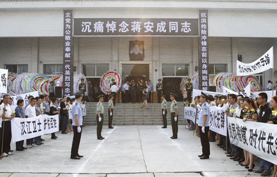 青山低头,江河呜咽。一大早,前来吊唁蒋安成同志的各界人士已站满了县殡仪馆大院,一条条横幅表达了对英雄的无比崇敬之情。菊花、黑纱、花圈和挽联寄托着无尽的哀思,纪念堂前,“沉痛悼念蒋安成同志”,“抗洪抢险冲锋在前、以身殉职践誓言“,“立党为公敬业奉献、一代英烈写忠诚”的巨幅挽联格外醒目。