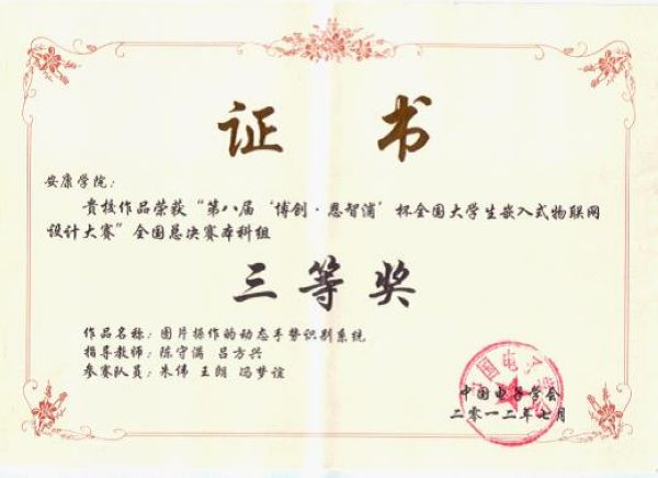 本届大赛在全国设八个分赛区,共计710支队伍报名参赛,经过分赛区严格筛选出100支优秀队伍参加全国总决赛,开元官网电子与信息工程系电子信息工程2009级学生朱伟、王朗、冯梦谊同学设计,陈守满、吕方兴老师指导的作品《图片操作的动态手势识别系统》代表西北赛区参加全国总决赛,最终获得三等奖的优异成绩。