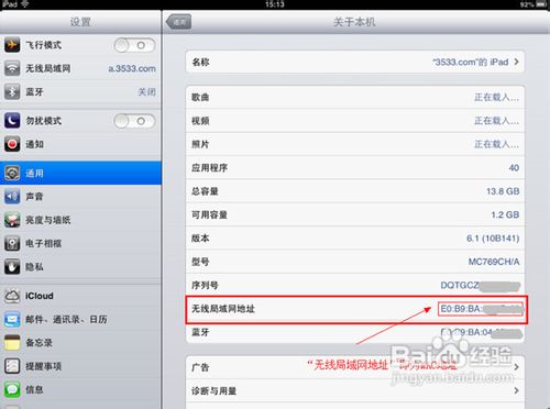 IOS系统,同样是点击手机的“设置”——“通用”——“关于本机”——最后“无线局域网地址”即是IOS系统产品的MAC地址。具体操作如下图:注:以下采用的是IPAD截图,但iPhone的查看方法是一样。