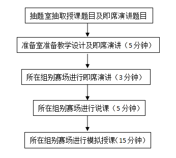 2.比赛由教学设计(含课件)、即席演讲、说课、模拟授课四个环节构成。大赛设计学段为学前及中、小学,内容以课程标准为准,不指定教材。大赛总分数为100分,其中,即席演讲20分,说课30分,模拟授课50分,教学设计(含课件)不计分。