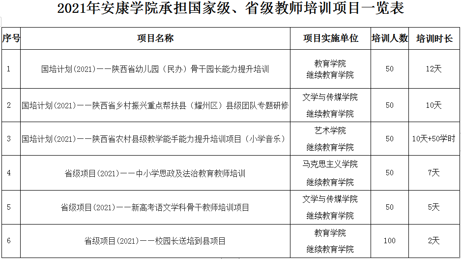 根据《陕西省教育厅办公室关于做好2021年“国培计划”—陕西省中小学幼儿园教师培训项目实施工作的通知》(陕教师办〔2021〕22号)及《陕西省教育厅办公室关于做好陕西省中小学教师培训项目2020年绩效自评和2021年申报工作的通知》(陕教师办〔2021〕11号)文件精神,继续教育学院协同相关二级学院认真调研、编制教师培训工作方案,积极组织申报。经国、省培项目现场评审答辩会及陕西省教育厅专家组评审,2021年开元官网获批国家级教师培训项目3项,省级教师培训项目3项。请相关二级学院、部门按照陕西省教育厅文件(陕教师办〔2021〕31、23号)要求,认真组织实施。