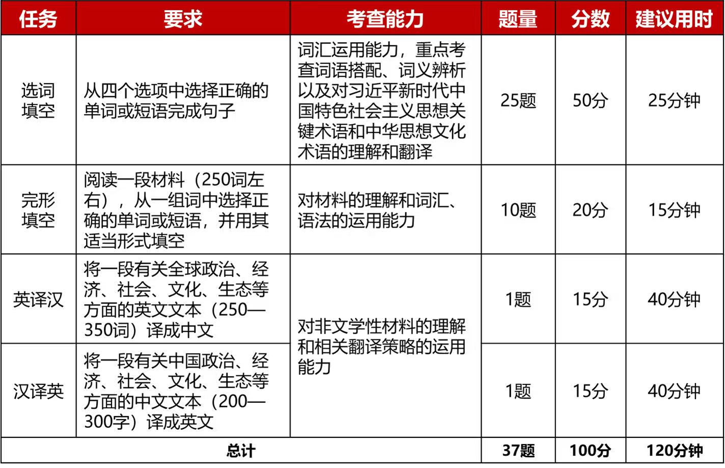 比赛题目:全国统一线上初赛赛题由大赛组委会提供,包括客观题若干道、英译汉(非文学翻译)1 篇、汉译英(非文学翻译)1 篇,赛题构成见表 1。