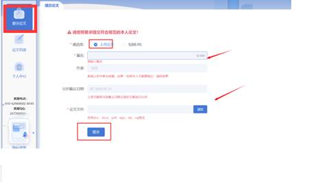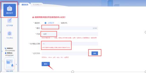 第二步:点击“提交论文”,选择“上传论文”(未发表过的论文),输入篇名、作者、比对截止日期选择前一天,上传文本后,点击提交。