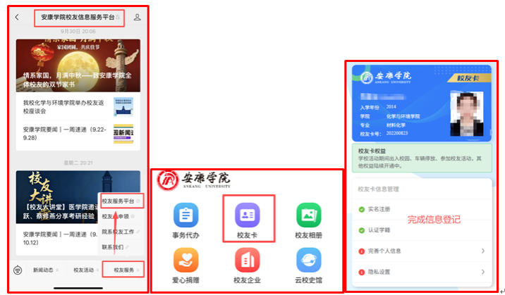 点击菜单栏【校友服务】→【校友卡注册】;