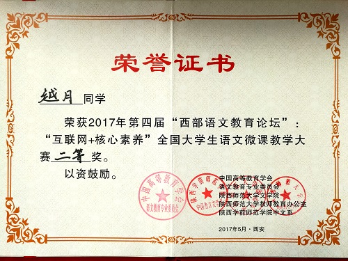 5月5日至8日,由中国高等教育学会语文教育专业委员会主办、陕西师范大学必赢76net线路官网承办的第四届西部语文教育论坛暨“互联网+核心素养”全国大学生语文微课教学比赛在陕西师范大学举行,来自全国38所高等院校的汉语言文学专业师生参加了本次会议。必赢官网教师徐雪梅、刘伟、张钧、陆有富,汉语言文学师范专业学生越月、聂婕、樊泽、李雯,参加了本次会议。越月参加了微课教学展示并获得二等奖,陆有富博士被评为赛会优秀指导教师。