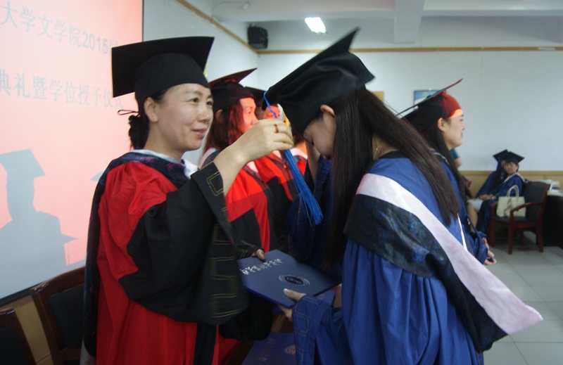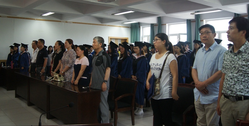 2015年7月6号下午三点,伴随着慷慨激昂的国歌声,必赢76net线路官网2015届硕士毕业典礼暨学位授予仪式在文史楼一号会议室隆重举行。导师代表万奇、王艳凤、郭培筠、高林广、马晓华、闫艳、王志强等出席仪式并为毕业生授予学位。副院长闫艳教授主持主持毕业典礼暨学位授予仪式。