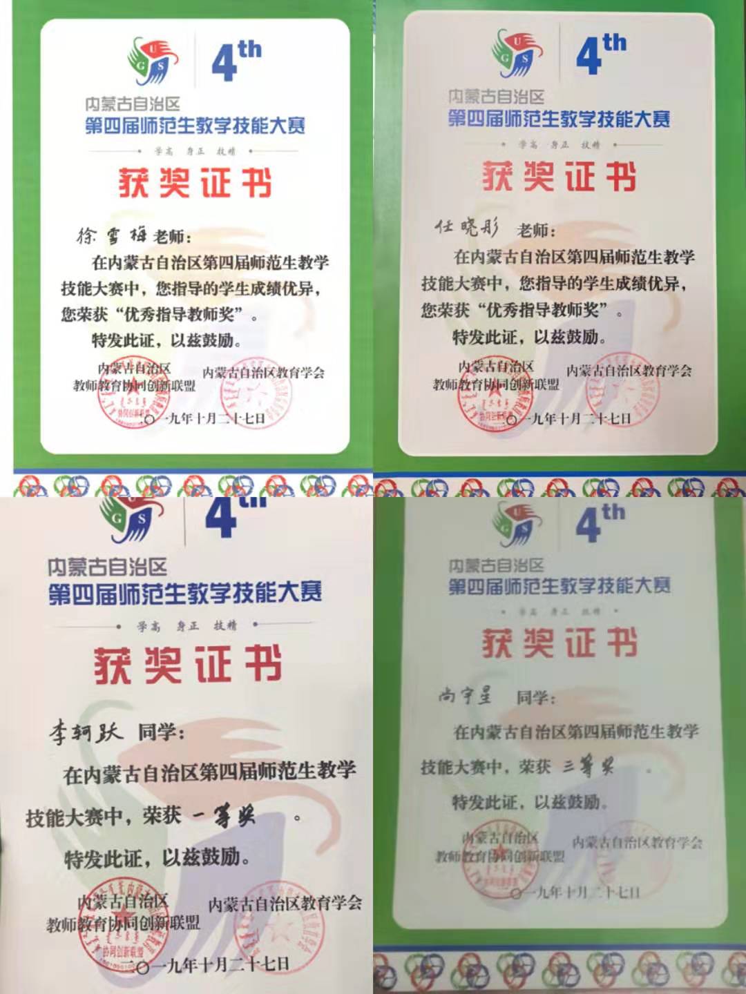 2019年10月25日至28日,由内蒙古自治区教师教育协同创新联盟和内蒙古自治区教育学会共同主办的内蒙古自治区第四届师范生教学技能大赛在内蒙古民族大学举行。来自全区六所高校的14名选手展开了激烈角逐,必赢官网李轲跃同学荣获汉语言文学(汉语)组一等奖,尚宇星同学获三等奖。指导教师任晓彤、徐雪梅荣获“优秀指导教师奖”。