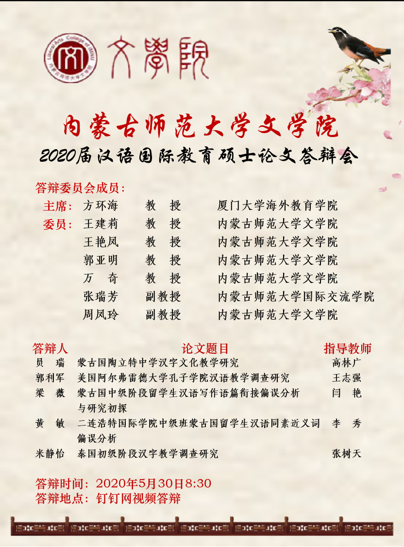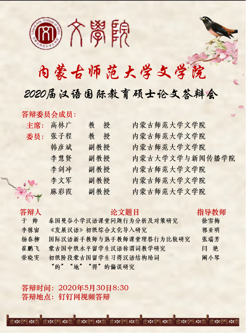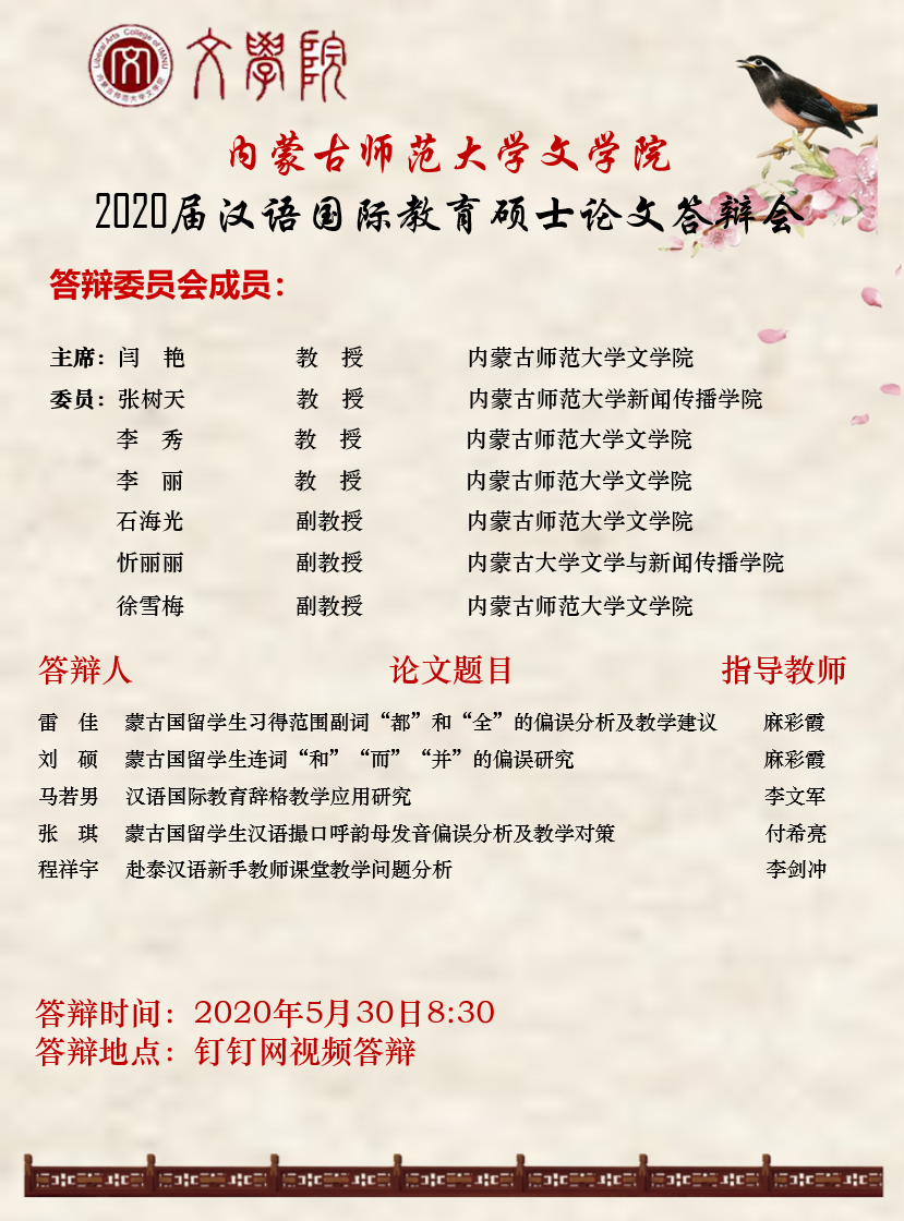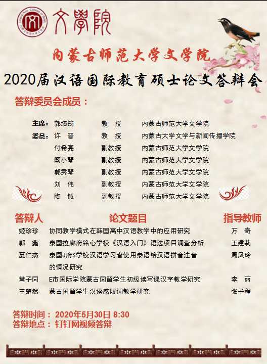 必赢76net线路官网2020届汉语国际教育硕士论文答辩会宣传海报