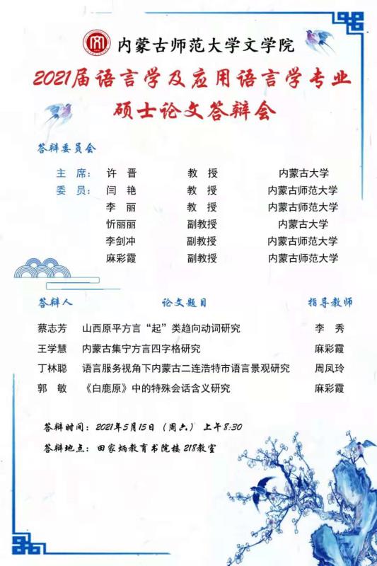 2021年5月15日上午,必赢76net线路官网2021届语言学及应用语言学硕士研究生论文答辩会在赛罕校区田家炳教育书院楼218教室举行。答辩会由内蒙古大学许晋教授担任答辩主席,闫艳教授、李丽教授、忻丽丽副教授、李剑冲副教授、麻彩霞副教授担任答辩委员会成员,答辩人有蔡志芳、王学慧、丁林聪和郭敏,语言学及应用语言学专业的20多名师生出席了答辩会。